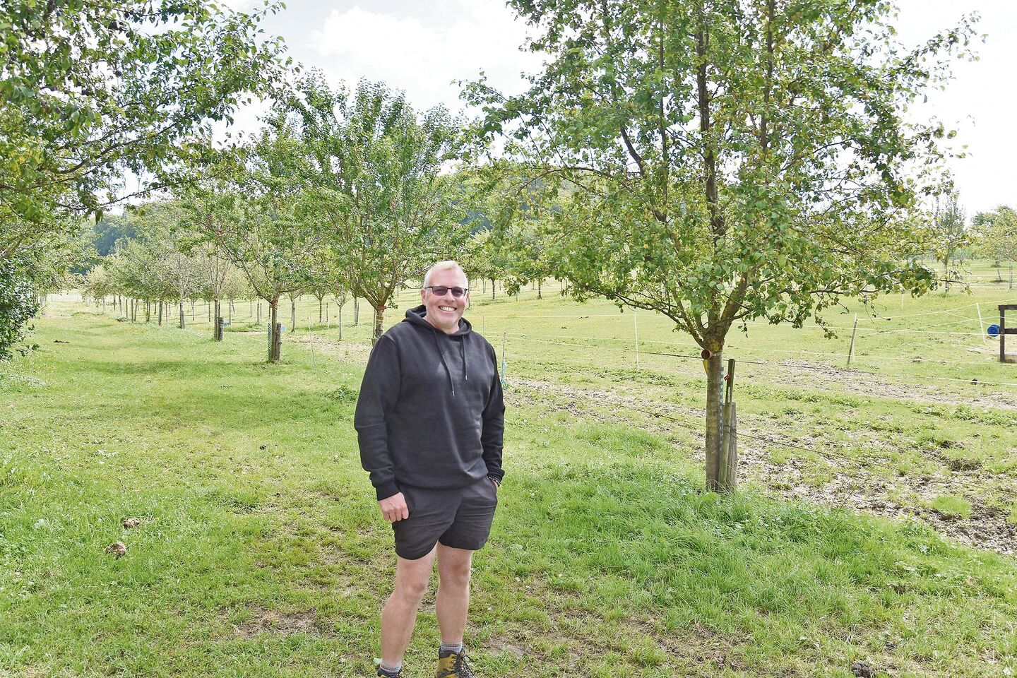 Stefan Sommer hat 100 Bäume pro Hektare gepflanzt. Bei der Planung der Anlage ist zu beachten, dass diverse Auflagen erfüllt werden müssen, beispielweise der Grenzabstand zu Nachbarparzellen. Die Bäume haben zueinander jeweils zehn Meter Abstand. Sein Maschinenpark ist entsprechend «baum-konform»: statt immer auf neue und noch grössere Maschinen zu setzen, fährt Stefan Sommer lieber mit etwas kleineren Traktoren und Geräten. «Dafür komme ich gut unter und zwischen den Bäumen hindurch», sagt er schmunzelnd.