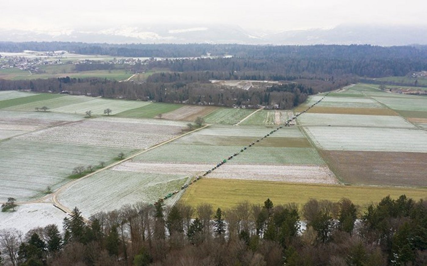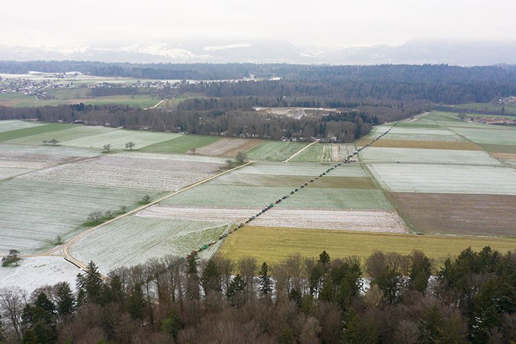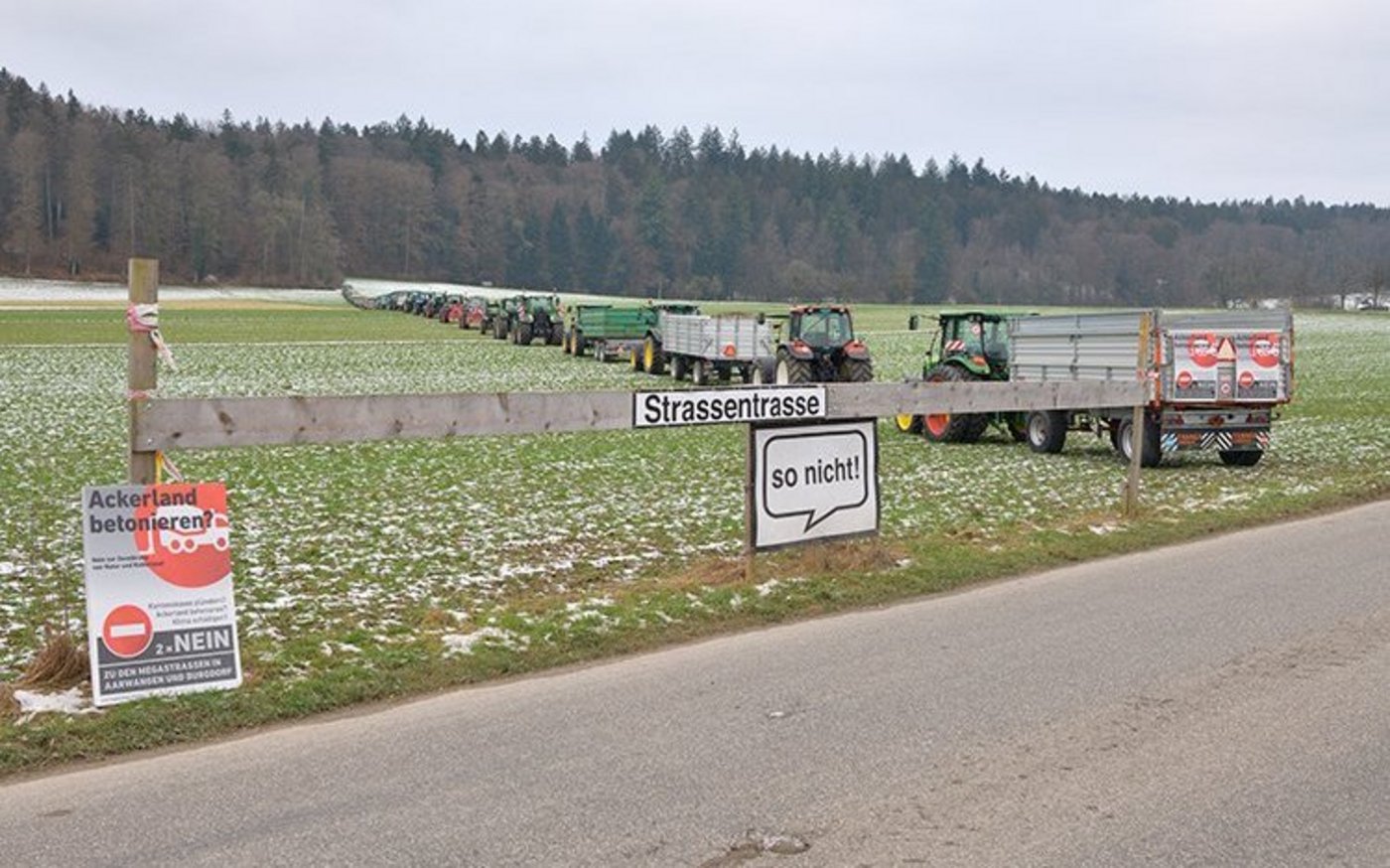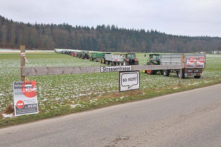 Pläne zu lesen und sich die Folgen eines Bauvorhabens im Feld vorzustellen, ist für Ungeübte keine leichte Aufgabe. In einer Protestaktion haben Landwirte aus der Region zusammengespannt, und mit 70 Traktoren anschaulich den Verlauf der geplanten Umfahrung Aarwangen gezeigt.