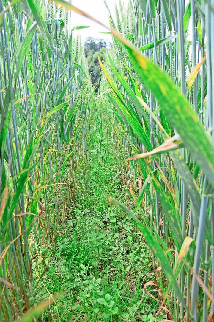 «Wir machen GWR seit einigen Jahren, einigermassen mit Erfolg», sagt Adrian Muff. Der Biolandwirt aus Schwarzenbach LU baut verschiedene Winterweizensorten an, in diesem Jahr auf Anraten eines Berufskollegen Nara. «Er war mehrmals hier und hat mir auch ein Bier bezahlt», erzählt Muff schmunzelnd am Feldrand. Nara ist für ihren kurzen Wuchs bekannt und hat beim Biolandwirt kaum bestockt, wodurch der Bestand sehr lückig geworden ist. Zwischen den Halmen wächst dafür eine bunte Ackerbegleitflora mit verschiedenen Mohnarten, Kamille und wildem Feldsalat, aber auch Überreste der winterlichen Gründüngung (Rettich, Ackerbohnen, Hafer und Wicke). Sie ist nicht vollständig abgefroren.
