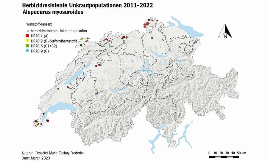 2023 hat Agroscope eine Karte zur aktuellen Verbreitung des resistenten Ackerfuchsschwanzes veröffentlicht (siehe unten). Demnach treten mehrere Resistenzen auf. Schaffhausen ist, neben Genf, am stärksten betroffen und es gibt auch doppelt resistente Populationen. «Der Sinn der Überwachung ist, Resistenzen zu bestätigen, neue zu überprüfen und so den Überblick zu behalten», erläutert Judith Wirth, Leiterin Herbologie bei Agroscope. Bisher konnten die Kantone kostenlos Pflanzensamen an Agroscope schicken, um Unkräuter auf Herbizidresistenzen prüfen zu lassen. «Da es heute möglich ist, Resistenzen gegen Herbizide in Speziallabors zu bestimmen, wurden die teuren und aufwendigen Versuche im Gewächshaus bei Agroscope aufgegeben», so Wirth. Jetzt müssten die Kantone ihre Proben nach Deutschland schicken, was jeweils rund 180 Euro koste und sich kaum jemand leisten wolle. «Dass Agroscope diesen Service nicht mehr anbietet, erschwert die rechtzeitige Erkennung von Herbizidresistenzen», sagt Lena Heinzer.