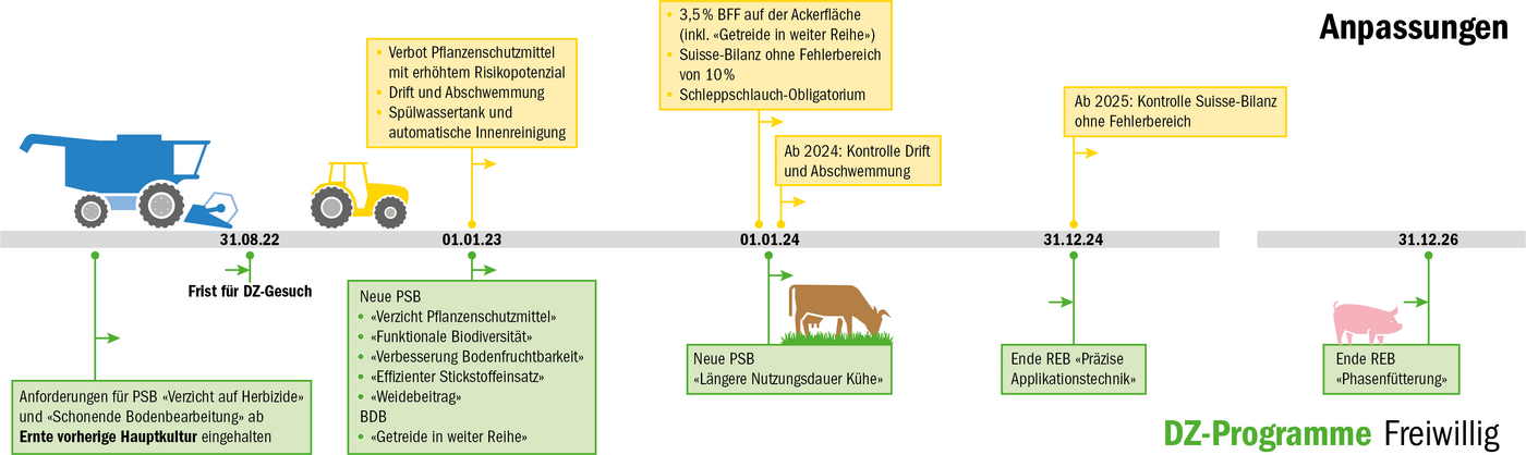Der 1. Januar 2023 ist ein wichtiger Tag auf dem Zeitstrahl der sich verändernden Agrarpolitik. Die neuen «freiwilligen» Produktionssystembeiträge (in der Grafik grün markiert) nehmen Fahrt auf. Während sie freiwillig sind, treten auch «Pflichtübungen» (sind in der Grafik gelb markiert), wie beispielsweise Spülwassertank und die automatische Innenreinigung bei Feldspritzen, in Kraft.