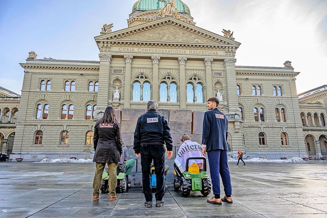 Die Agrarpolitik fahre Schweizer Bäuer(innen) an die Wand, ist Uniterre überzeugt. Nach einer passenden, symbolischen Aktion auf dem Bundesplatz erläuterte die Bauerngewerkschaft am Dienstag, 26. November, ihre detaillierten Vorschläge für eine bessere AP 2030.