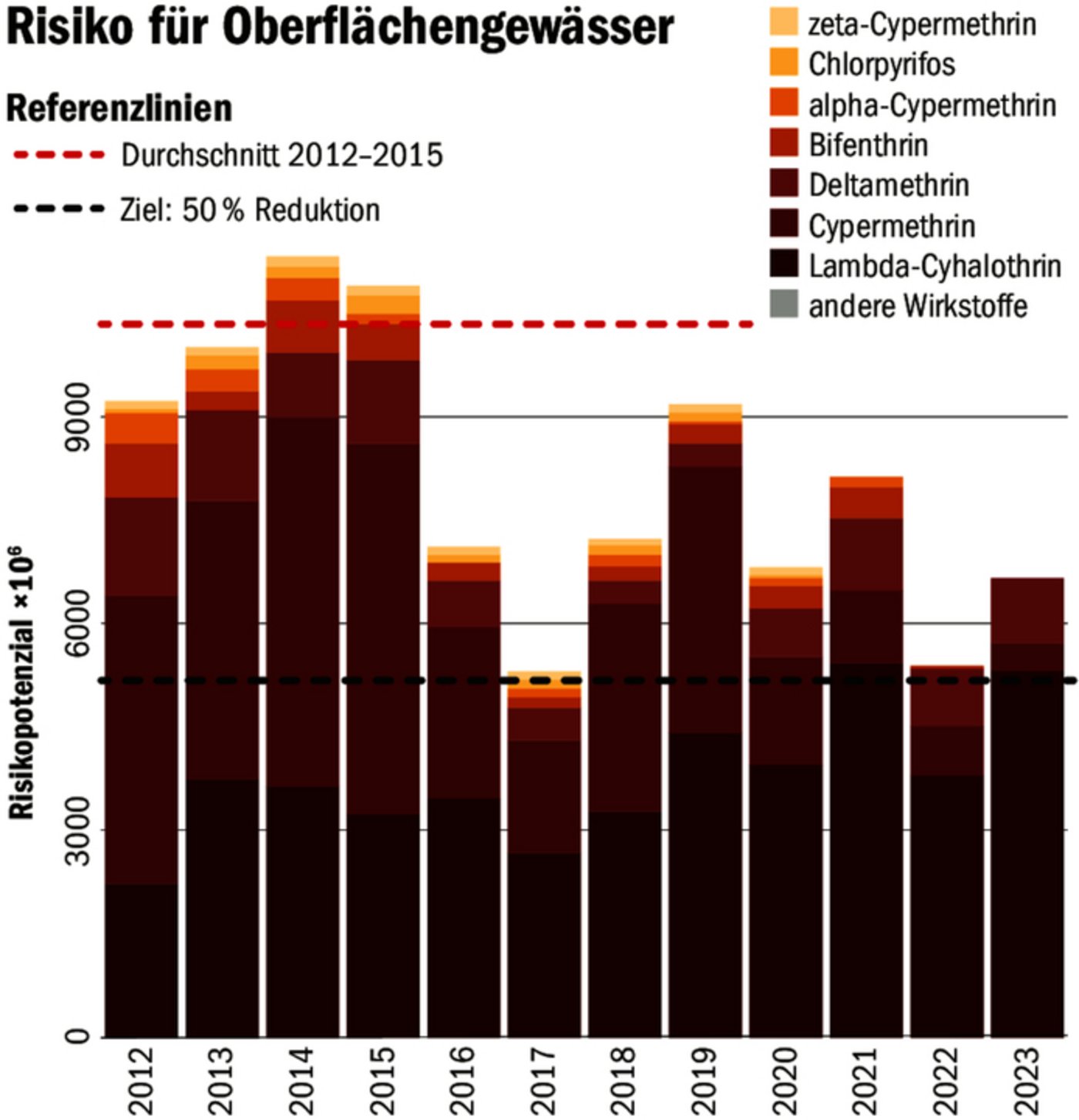 Ein Grund für eine solche Überprüfung sind Grenzwertüberschreitungen: Wenn Wirkstoffe oder deren Abbauprodukte entweder «wiederholt und verbreitet» in Konzentrationen von über 0,1 µg/l in Gewässern mit Trinkwassernutzung gemessen werden, oder wenn sie einen spezifischen ökotoxikologischen Grenzwert überschreiten. Je nach Wirkstoff liegen diese Grenzwerte massiv unter oder deutlich über der allgemeinen Schwelle von 0,1 µg/l. Es ist zu erwarten, dass ein spezifischer ökotoxikologischer Grenzwert für Deltamethrin – gegen den sich der SBV laut Medienberichten gewehrt hat – darunter liegen würde. Für Cypermethrin, ebenfalls ein Pyrethroid, beträgt er gemittelt über zwei Wochen 0,00003 µg/l.