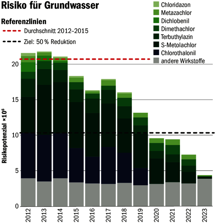 Hierbei zeigt der Jahresbericht zum Aktionsplan allerdings eine weitere Schwierigkeit: Sobald Daten zu einem Metaboliten vorhanden sind, tauchen sie auch in der Grafik zum Anteil damit verunreinigter Messstellen auf. Möglicherweise waren gewisse PSM-Metaboliten bereits früher vorhanden (vielleicht sogar in grösseren Konzentrationen), werden aber erst jetzt gemessen oder überhaupt dank technischem Fortschritt nachweisbar. Zudem verweilen mache Stoffe lange im Grundwasser.