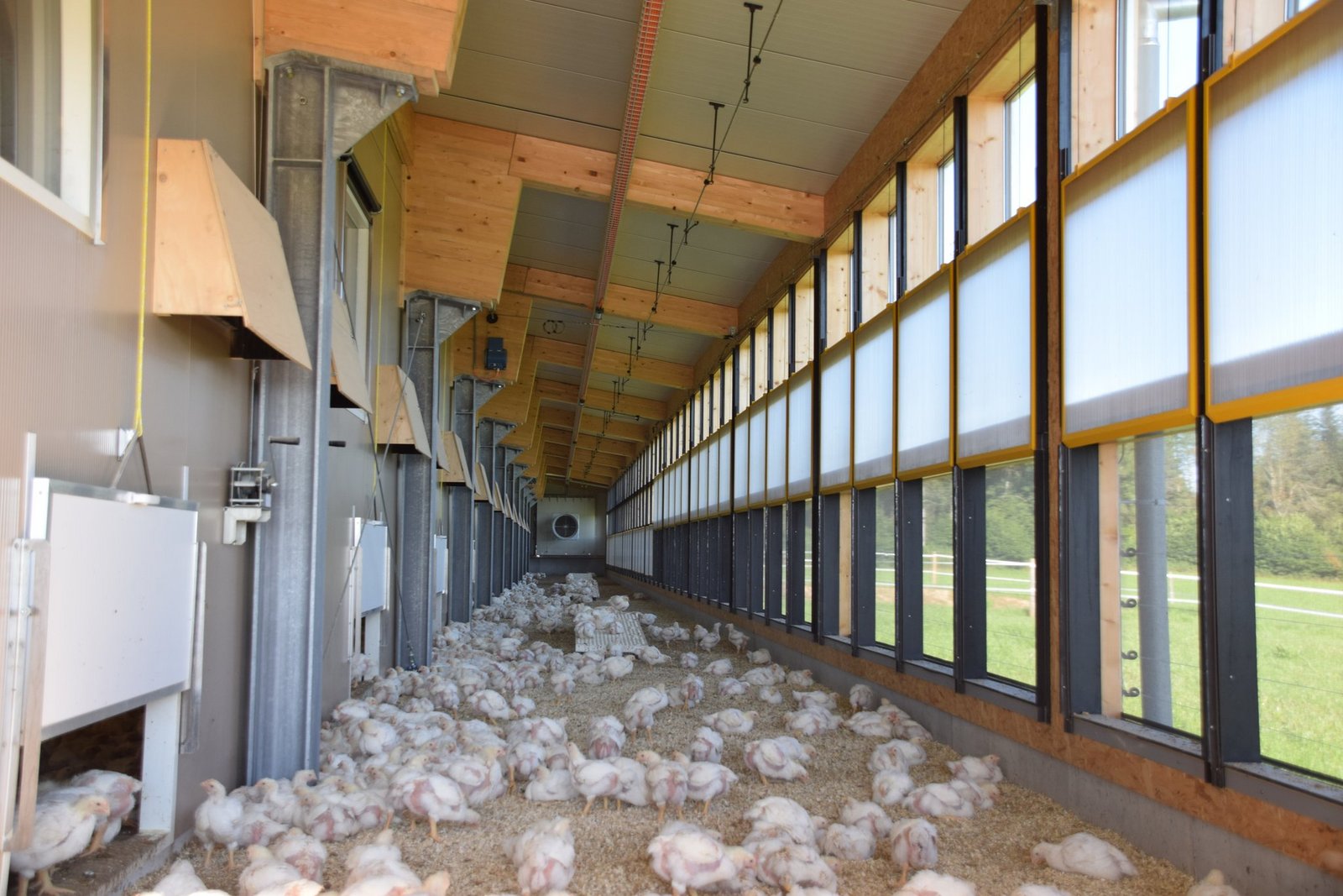Der neue Stall in Zimmerwald hat eine Innenfläche von 1000 Quadratmetern, dazu kommen zwei Aussenbereiche à je 160 Quadratmeter. Der Stall bietet Platz für durchschnittlich 16'000 Mastpoulets. (Bild lja)