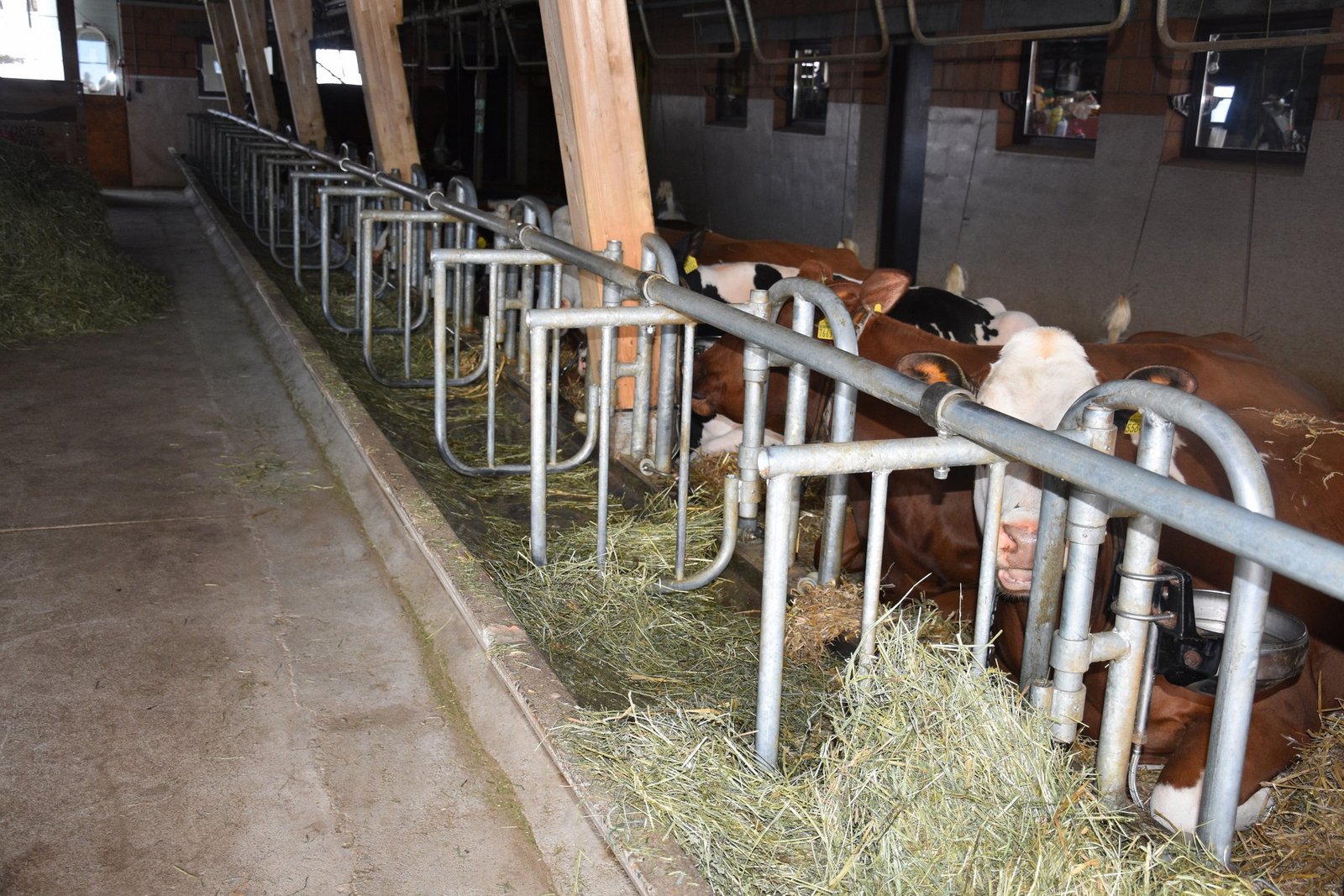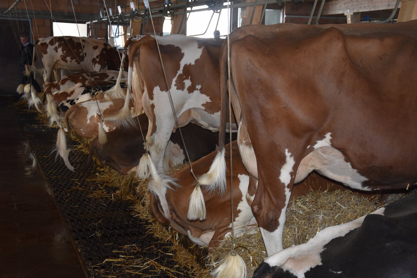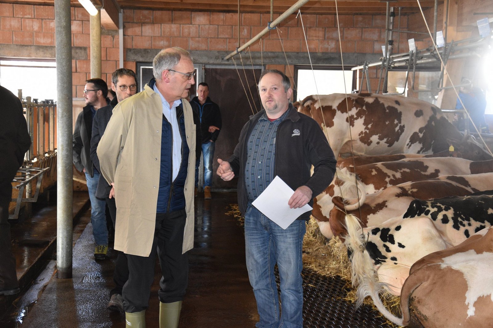 Die vielen Leute, die extra auf den Bio-Hof gekommen sind, warten gespannt was Guy Parmelin zu sagen hat. «Jetzt muss ich noch Hochdeutsch sprechen», meint Konrad Klötzli, Präsident der IG Anbindestall etwas verlegen. «I gugge itze o bi das no cha», sagt er im breiten Oberländer-Dialekt. Und ob er das noch kann: Der gewiefte Bergbauer hat den Bundesrat schnell um den Finger gewickelt und marschiert mit ihm durch den Stall. «Schauen Sie Herr Bundesrat wie schön es hier die Kühe haben», so Klötzli. Auch Beat Haldimann, Vize-Präsident der IG, nutzt die Chance und zählt die Vorteile eines Anbindestalls auf.