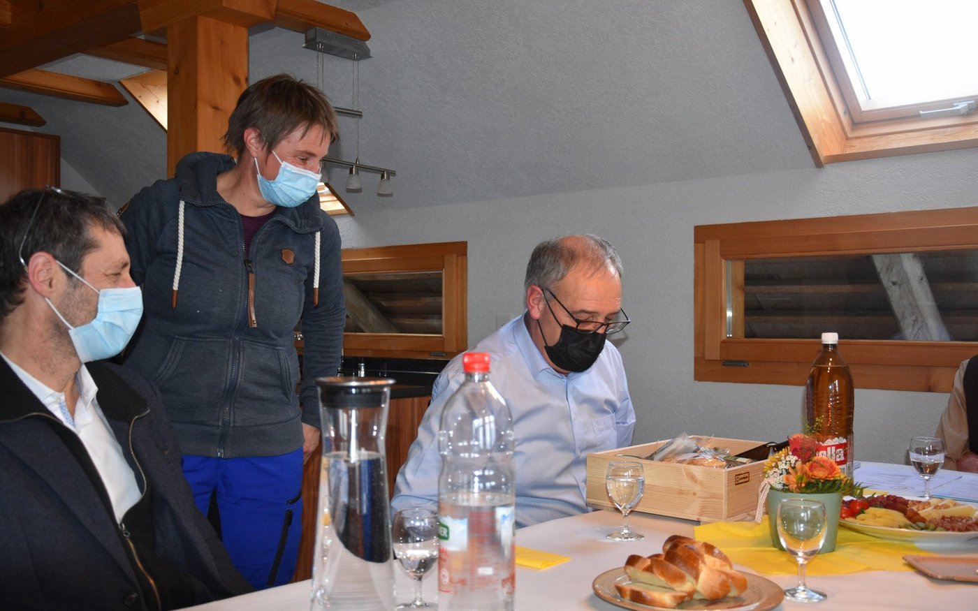 Auf dem 10-minütigen Fussmarsch von der Scheune zum Wohnhaus, nutzte Konrad Klötzli die Chance und erklärte dem Bundesrat, dass man die Anbindehaltung gegenüber dem Laufstall nicht benachteiligen sollte. «Herr Parmelin, das müssen Sie doch sagen, dass es die Kühe bei Stuckis schön haben». Und jetzt kommts, mit dem wohl niemand gerechnet hat: «Wissen Sie, ich habe bis 2011 selber noch in einem Anbindestall Kühe gemolken», sagt Guy Parmelin mit französischem Akzent auf Deutsch. Nun roch Klötzli die Lunte und fragte den Bundesrat gleich an, ob er denn nicht Mitglied bei der IG Anbindestall werden möchte. «Als Bundesrat darf ich nicht befangen sein. Vielleicht nachher, wenn ich nicht mehr im Amt bin», gibt Parmelin zur Antwort. «Wir haben mit Christoph Blocher und Markus Ritter schon zwei prominente Mitglieder, da würden Sie doch auch sehr gut dazu passen», meinte Klötzli.