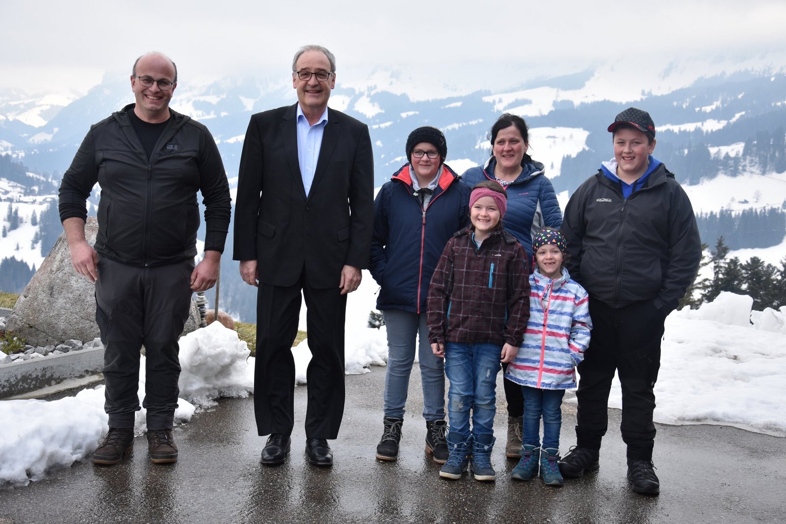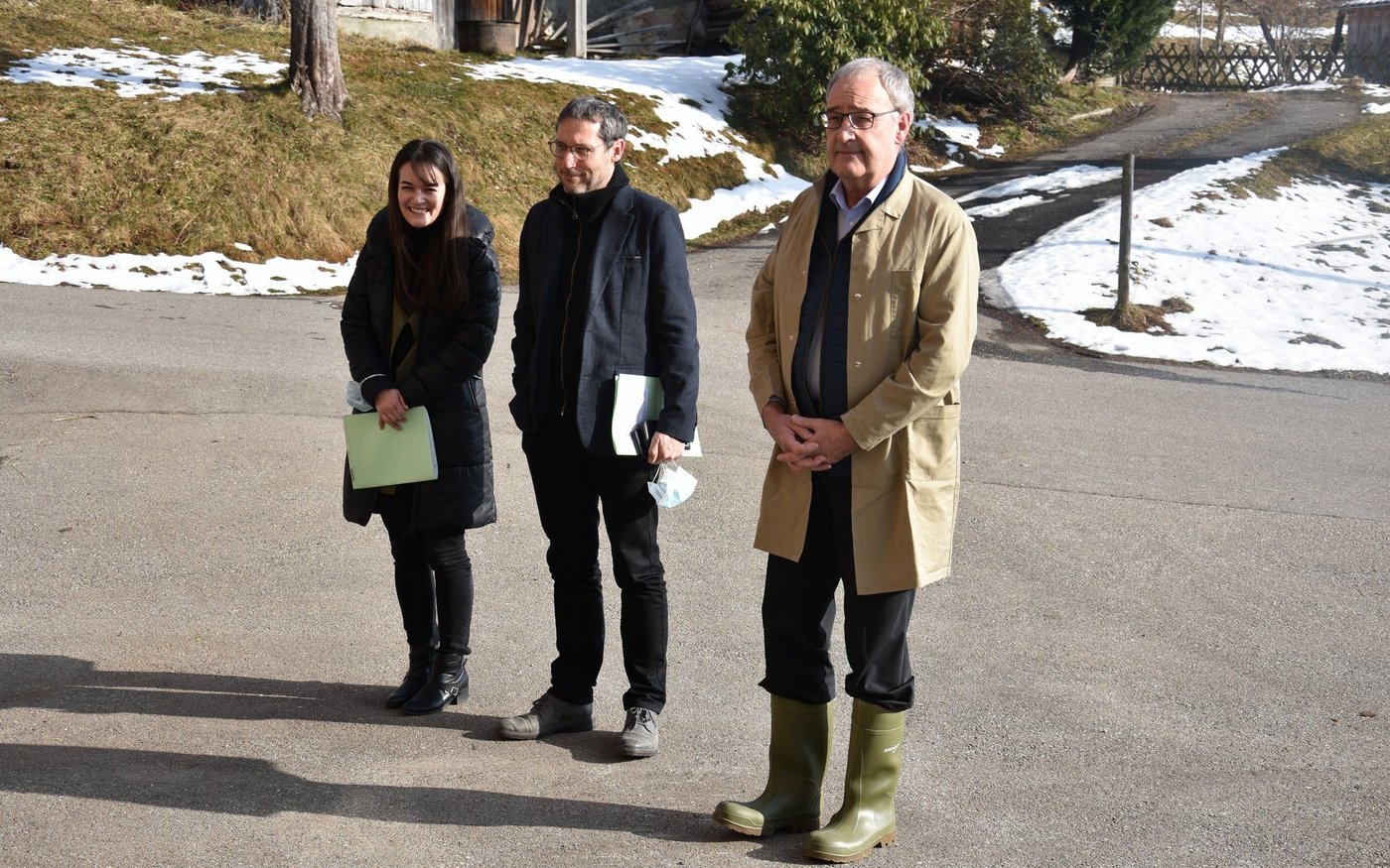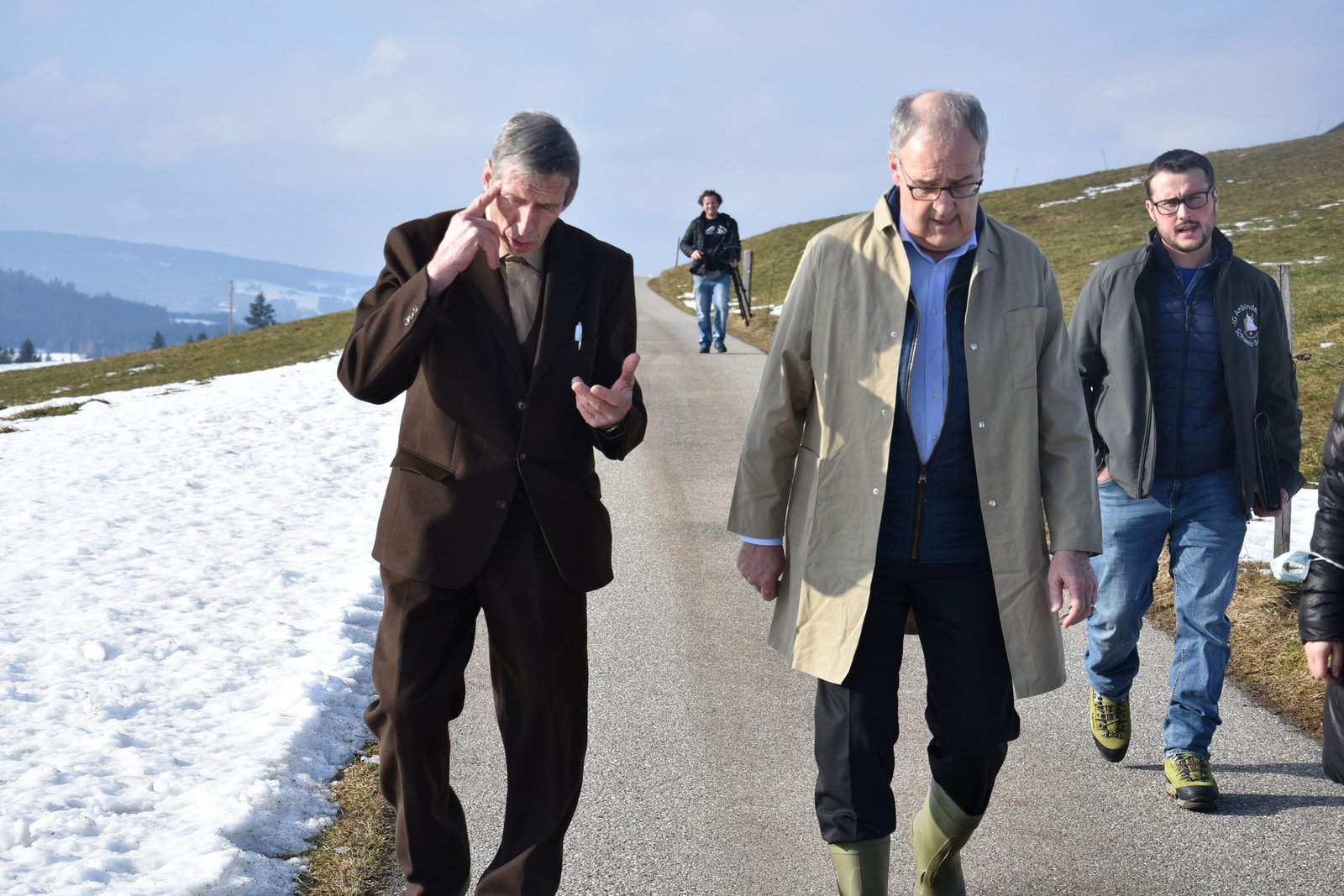 Das Wetter ist fantastisch, das Panorama könnte nicht schöner sein. Auf der linken Seite ist die Schrattenfluh, geradeaus thront der Hohgant. Endlich fährt die schwaze Limousine vor den Hof und Guy Parmelin steigt zusammen mit seiner Entourage aus dem Auto. Also Entourage ist ein wenig übertrieben: Kein Bodyguard ist zu sehen, sondern nur Frau Zippora Segessenmann vom Generalsekretariat und Urs Wiedmer, Kommunikationschef von Parmelins Departement. Nun schlüpft Parmelin in seine Gummistiefel und zieht ein Mäntelchen an - jetzt sieht er fast so aus wie ein Viehhändler, der bei Stuckis eine Kuh kaufen möchte.