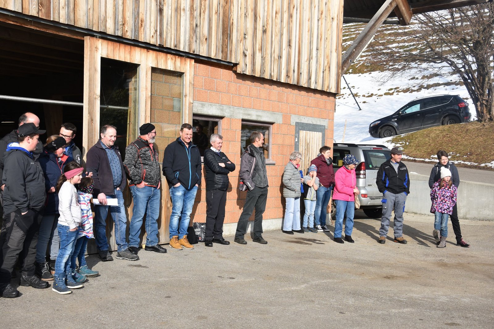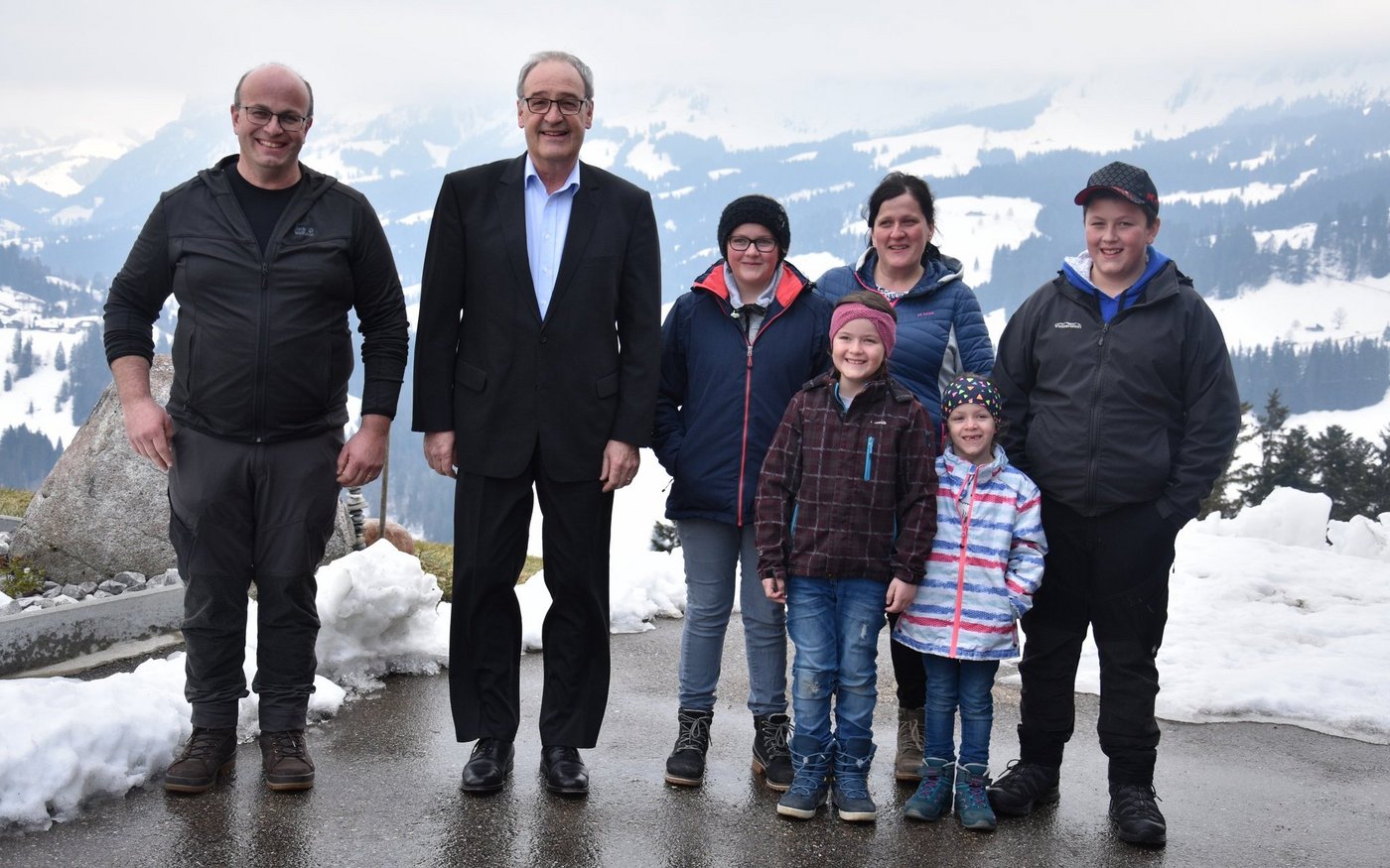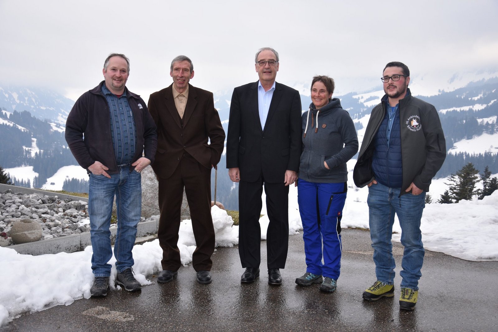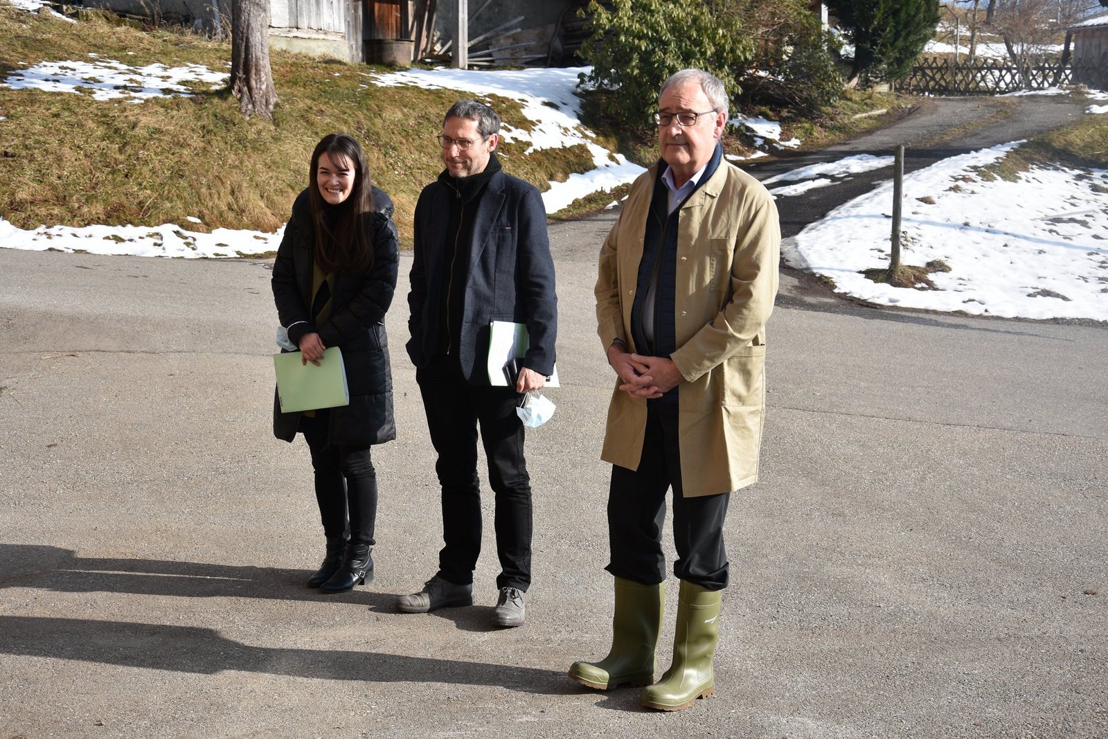 Das Wetter ist fantastisch, das Panorama könnte nicht schöner sein. Auf der linken Seite ist die Schrattenfluh, geradeaus thront der Hohgant. Endlich fährt die schwaze Limousine vor den Hof und Guy Parmelin steigt zusammen mit seiner Entourage aus dem Auto. Also Entourage ist ein wenig übertrieben: Kein Bodyguard ist zu sehen, sondern nur Frau Zippora Segessenmann vom Generalsekretariat und Urs Wiedmer, Kommunikationschef von Parmelins Departement. Nun schlüpft Parmelin in seine Gummistiefel und zieht ein Mäntelchen an - jetzt sieht er fast so aus wie ein Viehhändler, der bei Stuckis eine Kuh kaufen möchte.