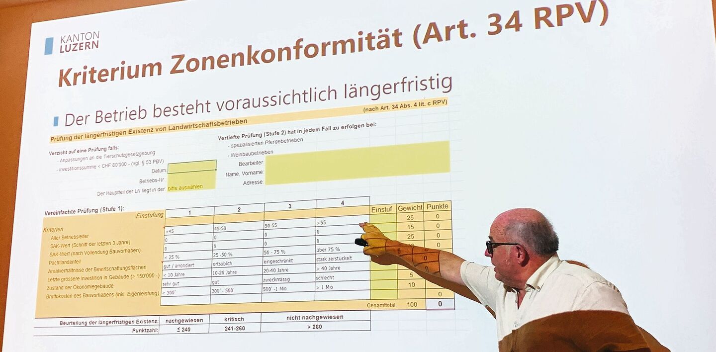 Stadelmann wies auch darauf hin, dass sehr eng mit Planern und Stallbauern zusammengearbeitet werde und alle Unterlagen für Beurteilungen transparent auf der Website aufgeschaltet seien. «Wir machen keine Schattenbeurteilungen.» Häufig zu Diskussionen führe das Kriterium Zonenkonformität, so bei Remisen. Die seien ohnehin ein heisses Eisen, und übermässige Flächen müssten reduziert werden, wenn sich zeige, dass die Richtwerte für SAK, Flächenbedarf oder Stroh- und Heulager nicht eingehalten würden. Stadelmann mahnte, dass eben Einstellhallen nur für landwirtschaftliche Zwecke bewilligt werden könnten, aber nicht für Wohnwagen, Camper oder Oldtimer-Fahrzeuge. Auch die Beurteilung, ob der Betrieb längerfristig existenzfähig sei, werde oft als einengend empfunden, diese Auflage sei aber vom Bund eingefordert worden. Auch die nötige Beurteilung der Bodenabhängigkeit mit Deckungsbeitrag- und Trockensubstanzbilanz ge-he auf einen Gerichtsentscheid zurück.