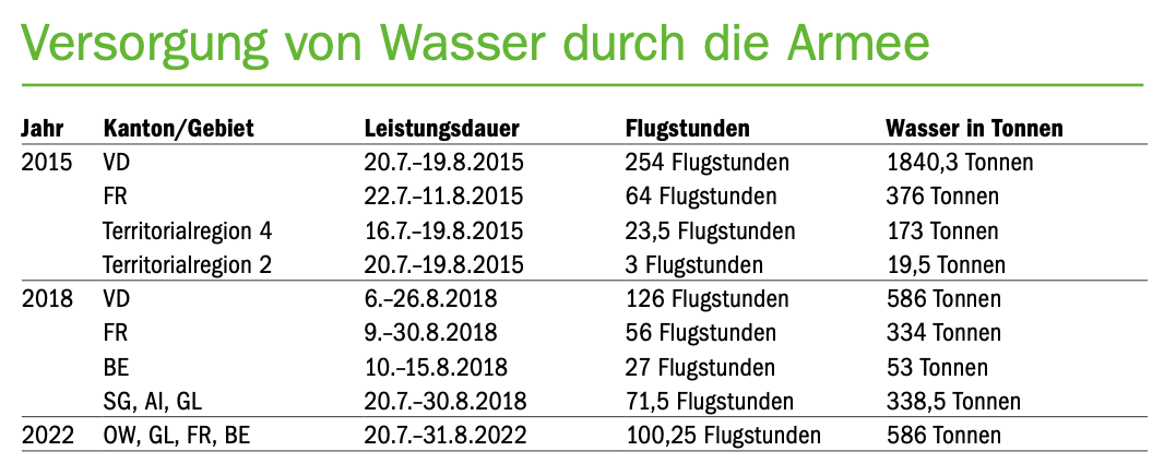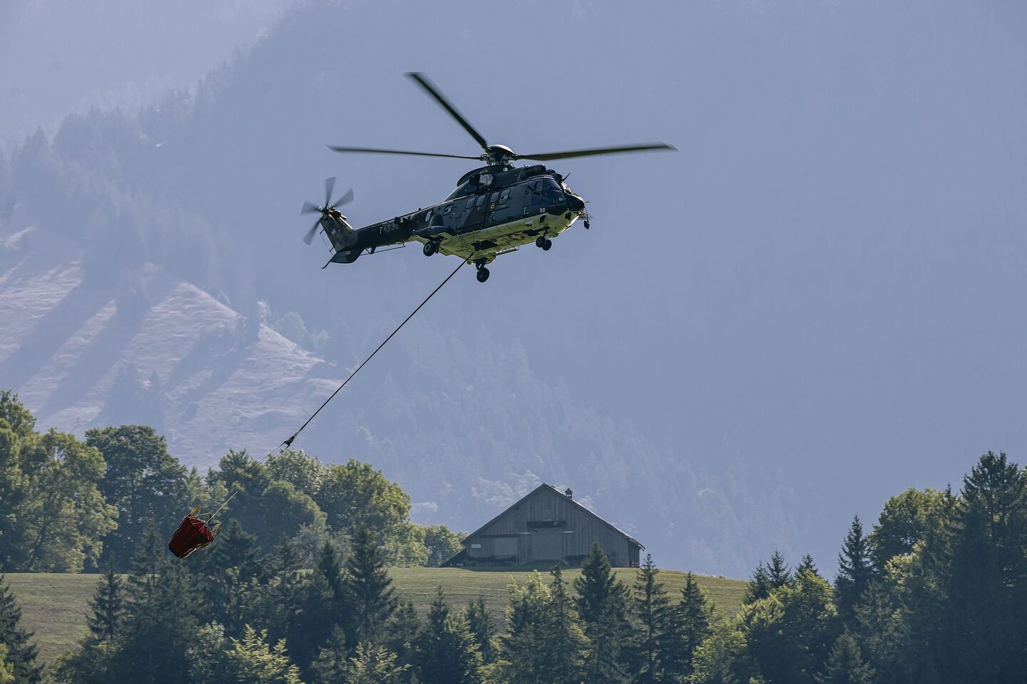 Wegen der Trockenheit hatten letztes Jahr viele Alpbewirtschafter Mühe, ihr Vieh mit ausreichend Wasser zu versorgen. Die Kantone suchten deshalb Hilfe bei der Schweizer Armee. So werden die Armee-Helikopter sehr geschätzt, denn sie transportieren auf einmal anderthalb Tonnen Wasser – drei- bis fünfmal mehr als ein ziviler Heli. Die Armee hilft allerdings nur, wenn das nicht auch zivile Dienstleister tun können.