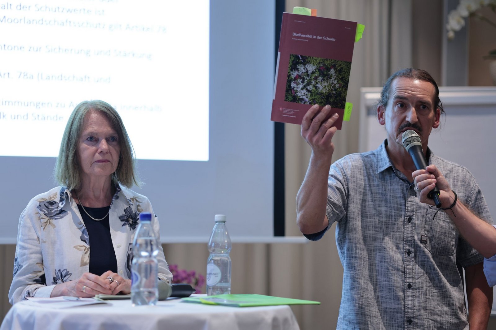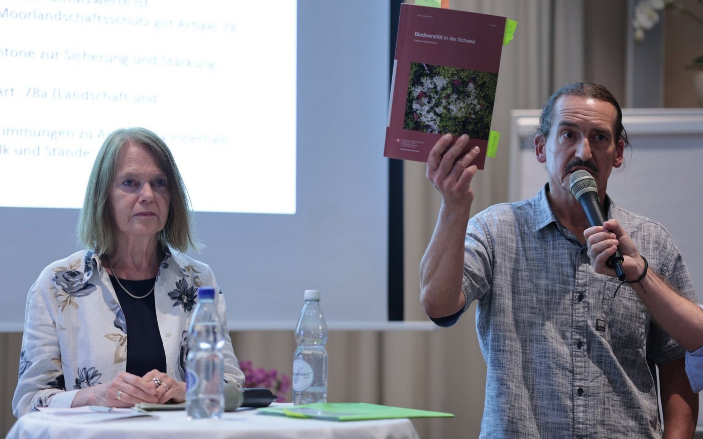Die tiefste Zahl lieferte hierbei Claudia Friedl, Nationalrätin der SP und Vorstandsmitglied vom WWF Schweiz. Sie verwies auf die 2 % der Landesfläche, welche unter anderem die Moore beinhalte und streng geschützt sei. Der Bericht zur Biodiversität vom Bundesrat spricht wiederum von 13,4 %, diesen hielt Lukas Tobler, Präsident von Pro Natura St. Gallen-Appenzell, ausgedruckt in die Höhe, als er auf die entsprechende Zahl verwies. Auch Tobler ist ein Befürworter der Initiative.
