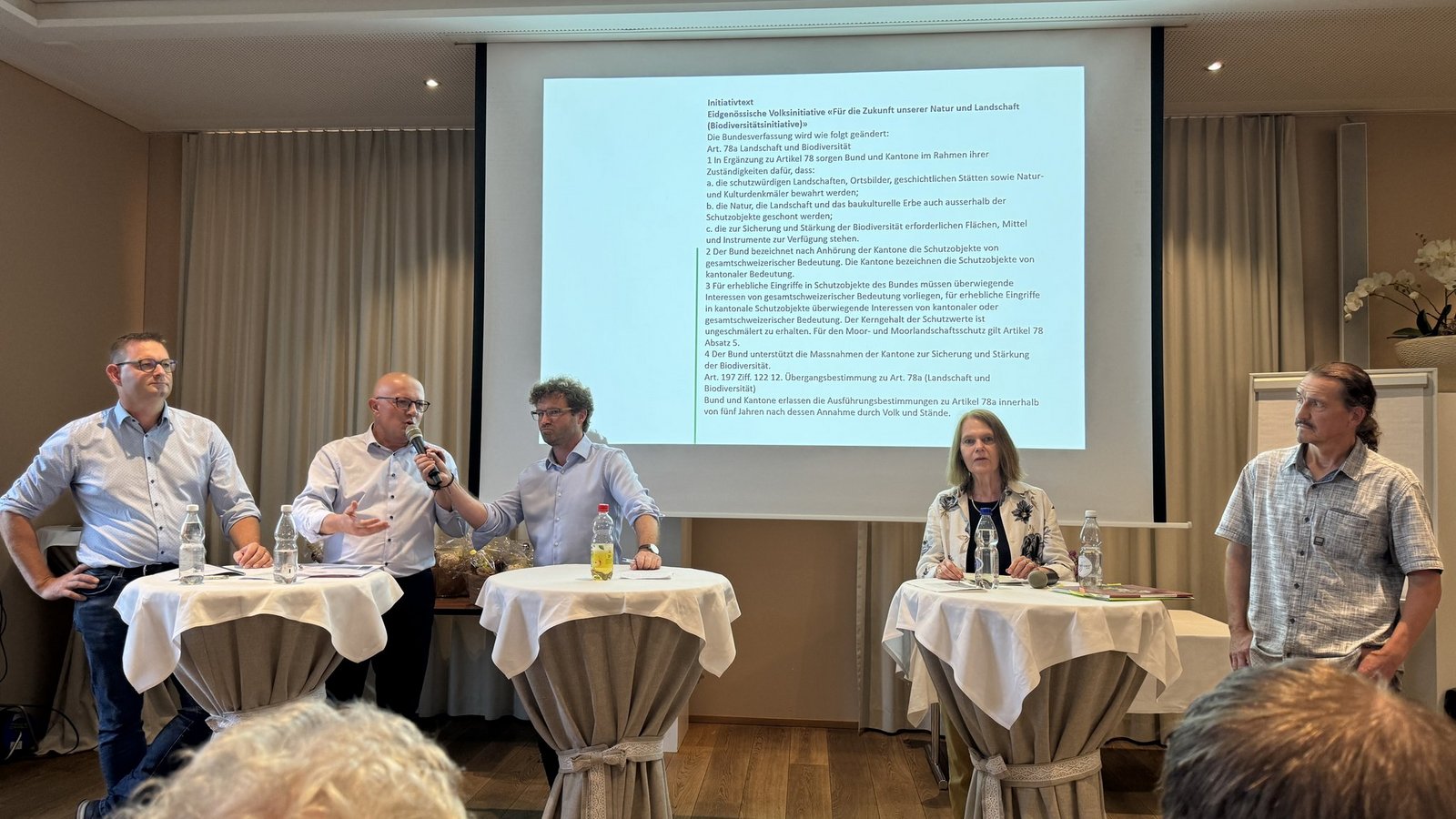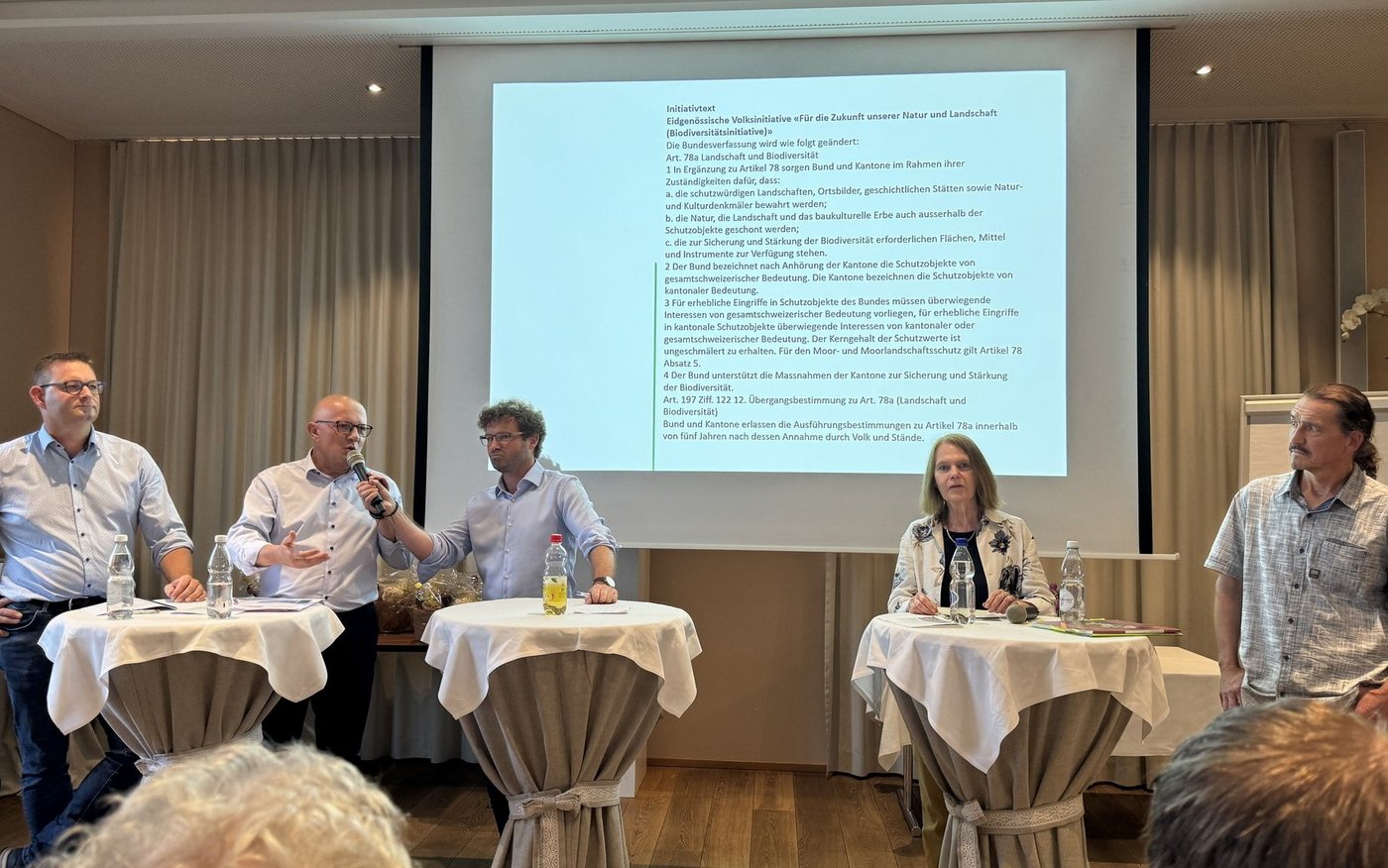 Das sei so nicht ganz korrekt, meinte Nicolò Paganini, Mitte-Nationalrat und Präsident von Schweiz Tourismus, weil wichtige Flächen bei der Errechnung nicht mitberücksichtigt worden seien. Wildtierkorridore oder brachliegende Alpen seien zum Beispiel nicht mitgezählt worden. Nehme man diese hinzu, komme man, laut Paganini, bereits auf 23 %. Für Peter Nüesch, FDP-Kantonsrat und Präsident des St. Galler Bauernverbandes, stand fest, dass die Initianten eine Fläche von 30 % anpeilen. Dies sei eine Flächenzunahme in der Grössenordnung von mehreren Mittellandkantonen.