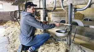 So stehen die laktierenden Kühe auf dem zweiten Betriebsstandort in Spiez. Die Schlüsselmatte, wie der Hof heisst, hat das AGG von der Burgergemeinde Bern in Pacht und an Silas Wyss weiter verpachtet. Zweimal am Tag fährt er nun zum Melken ins Tal und bringt den vollen Milchtank wieder zurück auf den Hondrich. So kann die Leistungsvereinbarung, welche eine Bedingung für das Weiterbestehen des Pachtvertrags ist, trotzdem erfüllt werden.