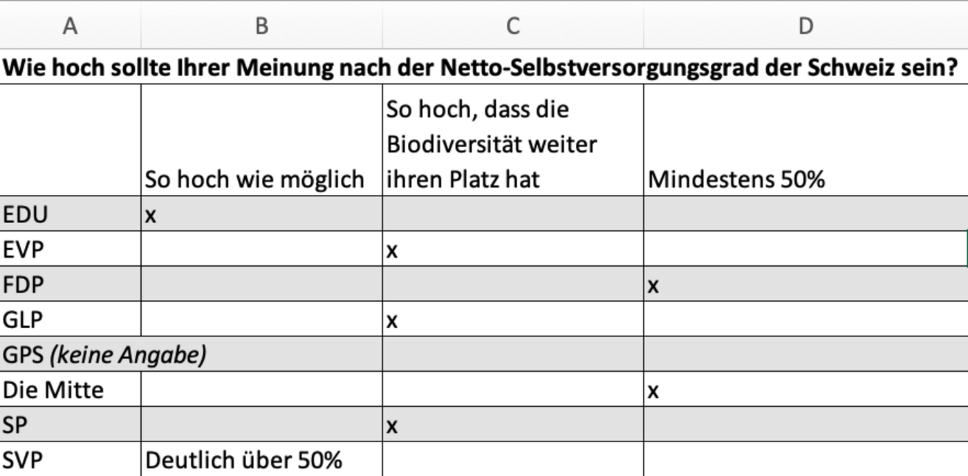 Die Mitte: Die Ernährungs-Initiative will gemäss Initiativtext einen Nettoselbstversorgungsgrad von 70 Prozent. Dies ist völlig unrealistisch. Ein solches Ziel wäre heute nur mit massiven Einschränkungen beim Konsum der Bevölkerung zu erreichen.