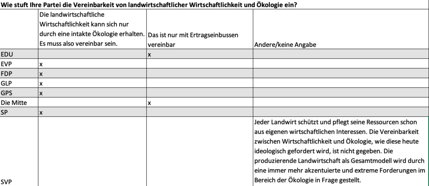 EDU: Die EDU befürwortet und beurteilt die aktuelle produzierende Landwirtschaft als Natur-schonend, den IP-Standard als genügend oekologisch. Die aktuellen Bestrebungen zu noch mehr Oekologie-Einschränkungen nach grünem Verständnis und anlogen Ideologien betrachtet die EDU als nicht zielführend und kontraproduktiv zu den Zielen der Versorgungssicherheit. So lehnt die EDU z.B. diverse Projekte zur Vernässung von Ackerland zu Gunsten der Artenvielfalt klar ab.