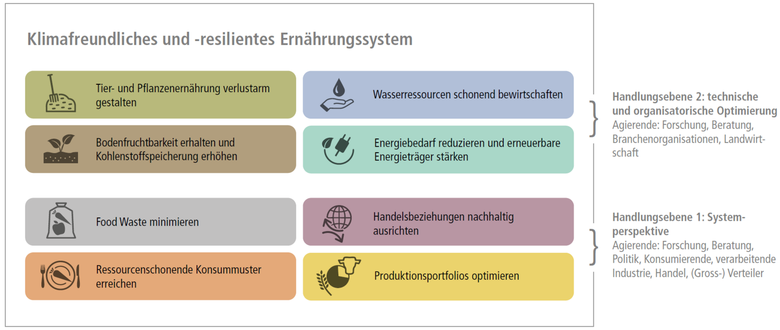 Produktionsportfolios: Reduktion der Nahrungsmittel- und Flächenkonkurrenz, Acker- statt Futterbau, Direktzahlungen und Marktzulagen gezielter einsetzen, neue Beratungs- und Weiterbildungsangebote, Einschätzung der Tiergesundheit dank Digitalisierung verbessern, Strukturverbesserungen für ressourcenschonende Bauten, Anlagen und Maschinen, Stärkung von Pflanzenbau und Züchtung, Revision Sortenprüfung.