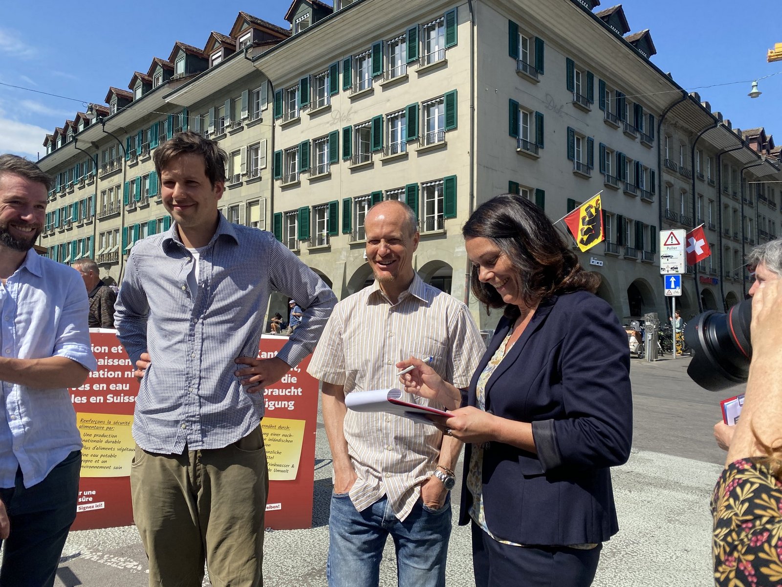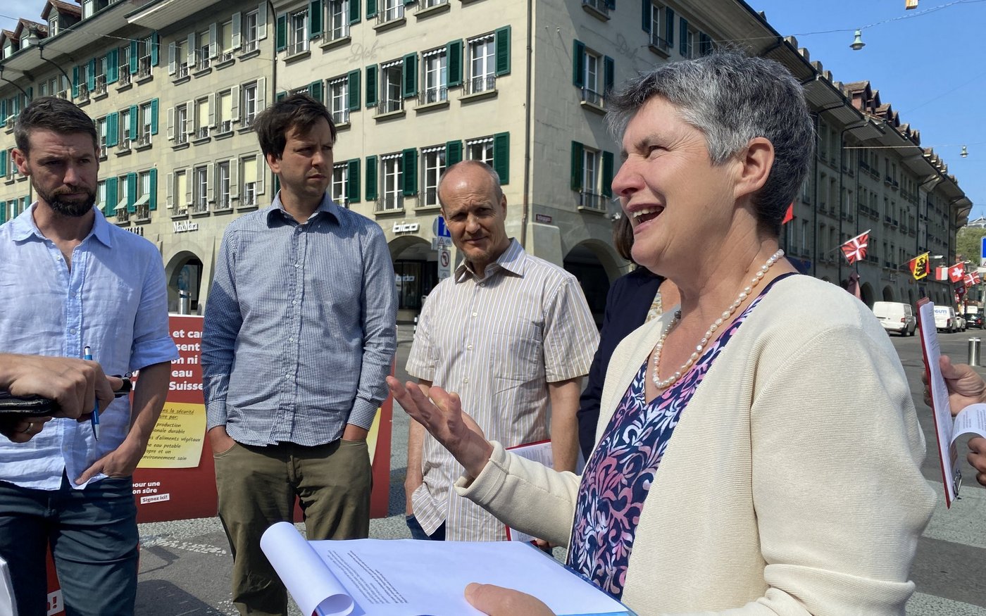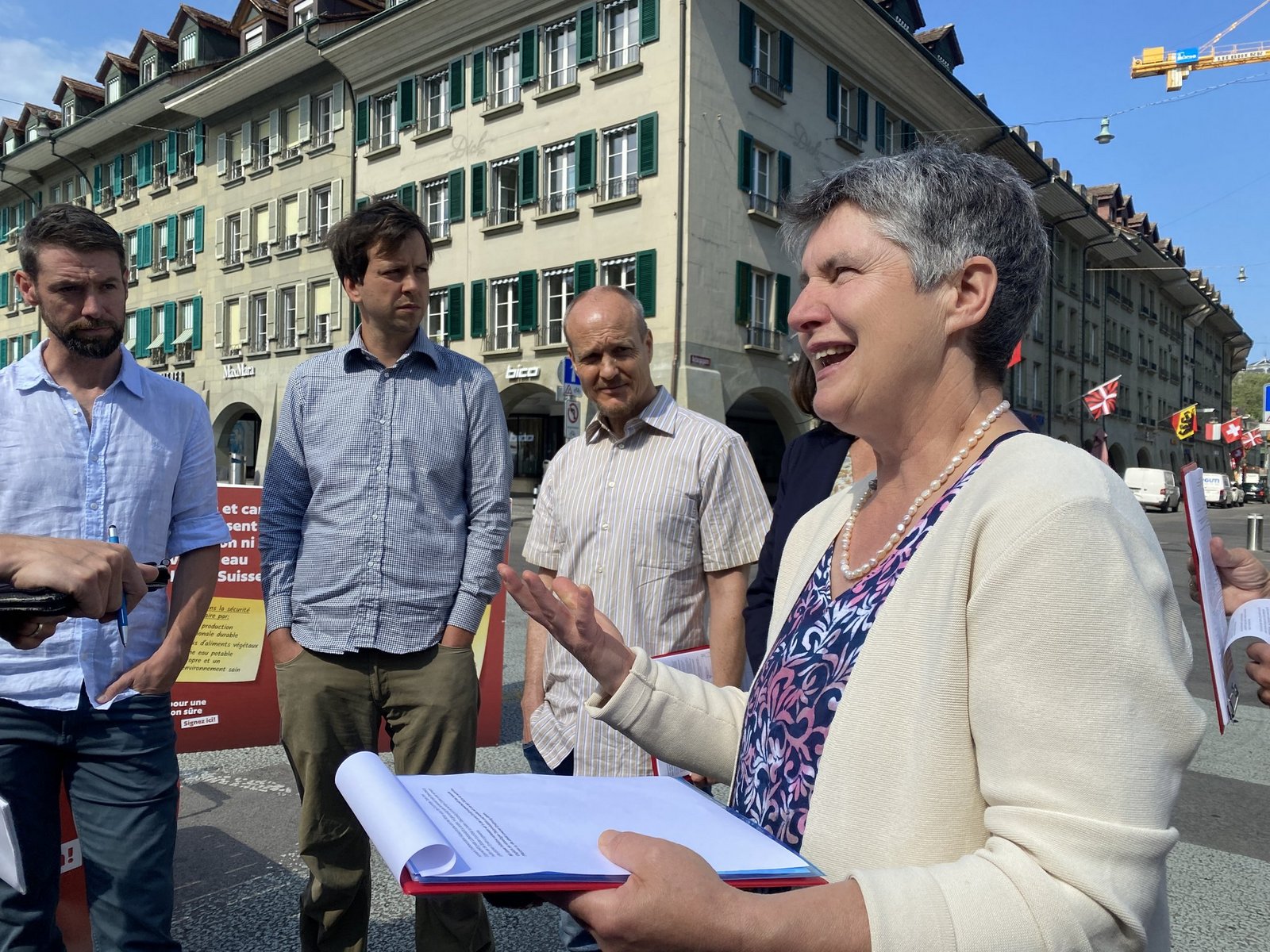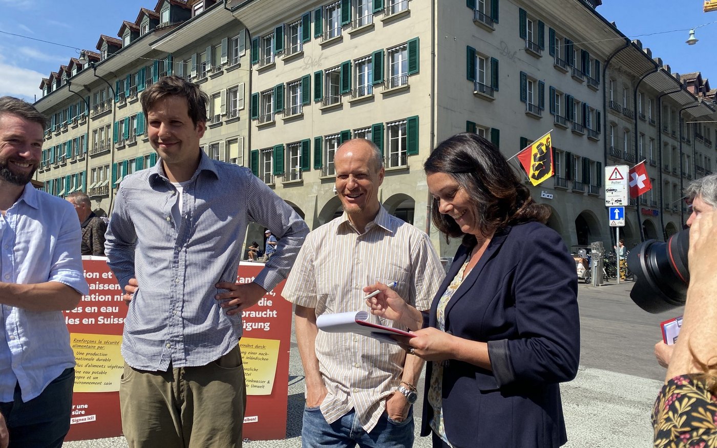 Heute versammeln sich Anhänger(innen) der neuen Initiative für eine sichere Ernährung auf dem Waisenhausplatz in Bern. Mit einem Appell zur «Stärkung einer nachhaltigen inländischen Produktion, mehr pflanzliche Lebensmittel und sauberes Trinkwasser» ruft Franziska Herren vom Verein «Sauberes Wasser für alle» zur Unterschriftensammlung auf.