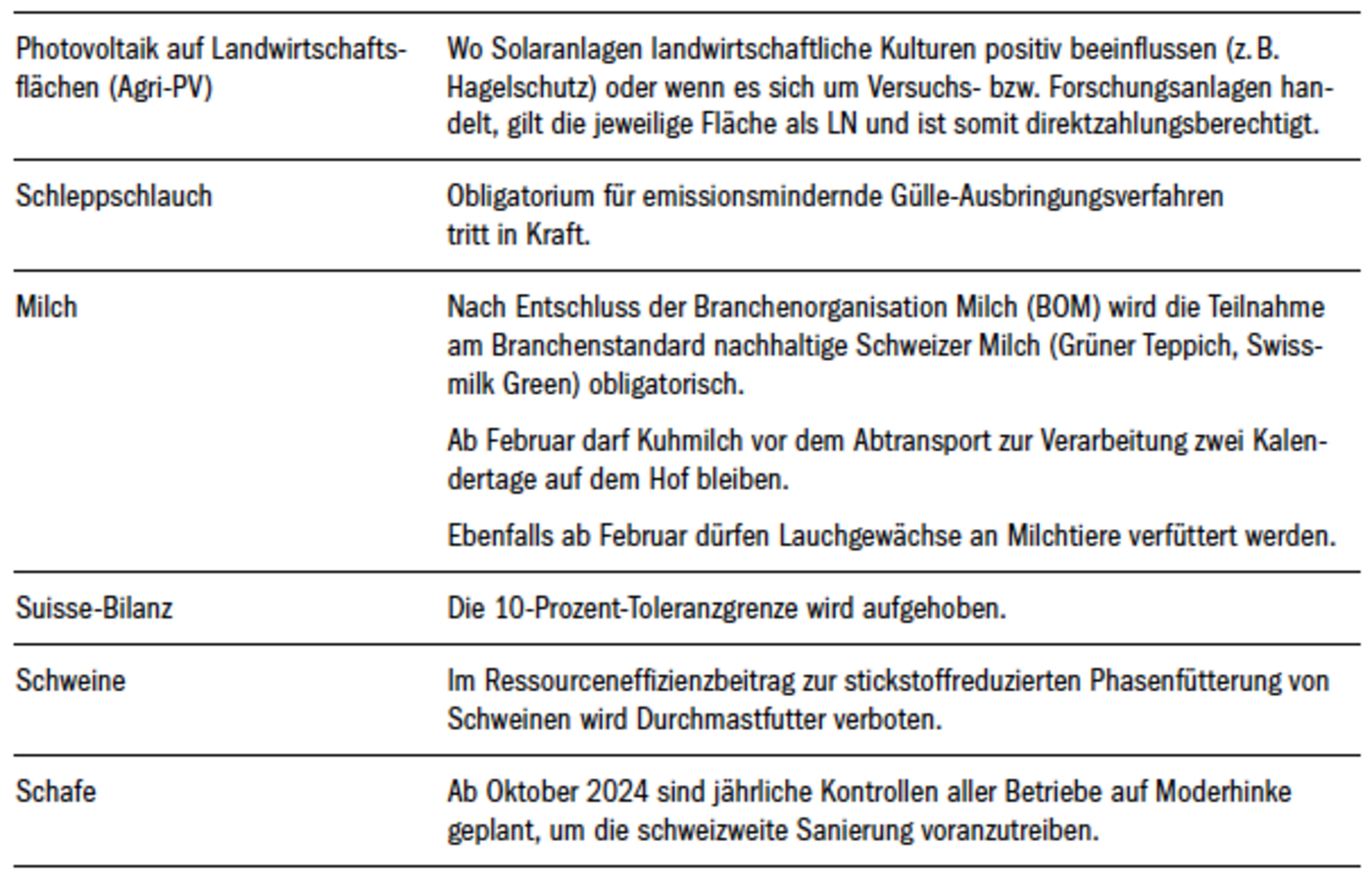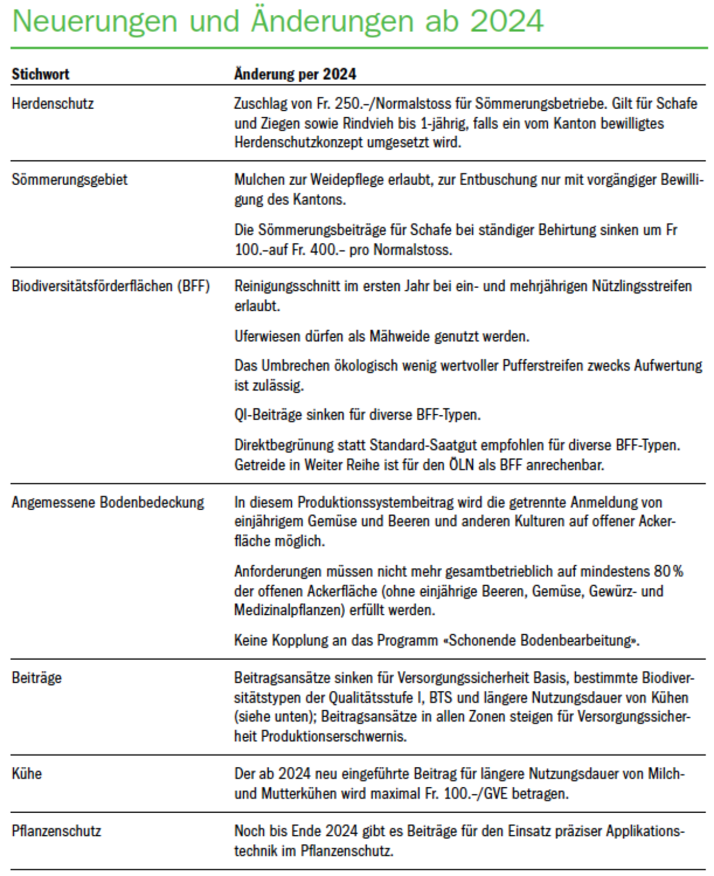 Neues Jahr, neue Vorschriften, das gilt für 2024 in besonderem Masse. Einerseits gibt es wie gewohnt zahlreiche Anpassungen aus Bundesbern im Rahmen des Landwirtschaftlichen Verordnungspakets. Dessen Herzstück ist dieses Jahr eine Umlagerung der Direktzahlungen, um die hohe Teilnahme an den neuen Produktionssystembeiträgen (PSB) zu finanzieren.