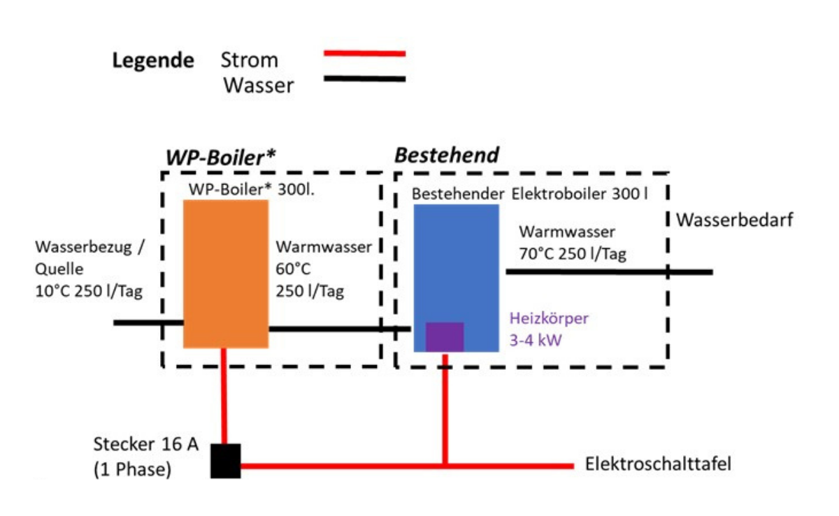 - Der Wärmepumpenboiler erreicht einen Wirkungsgrad von durchschnittlich 3,2. Das bedeutet, aus einer Kilowattstunde Strom werden 3,1 Kilowattstunden Wärme produziert.