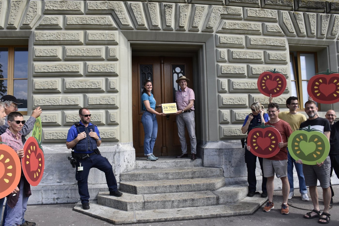 24780 Personen unterschrieben die Petition, die die Bundeskanzlei in Bern heute entgegennahm. Die Petition setzt sich für eine Verlängerung des des Gentech-Moratoriums in der Schweiz ein, das Ende 2025 ausläuft.