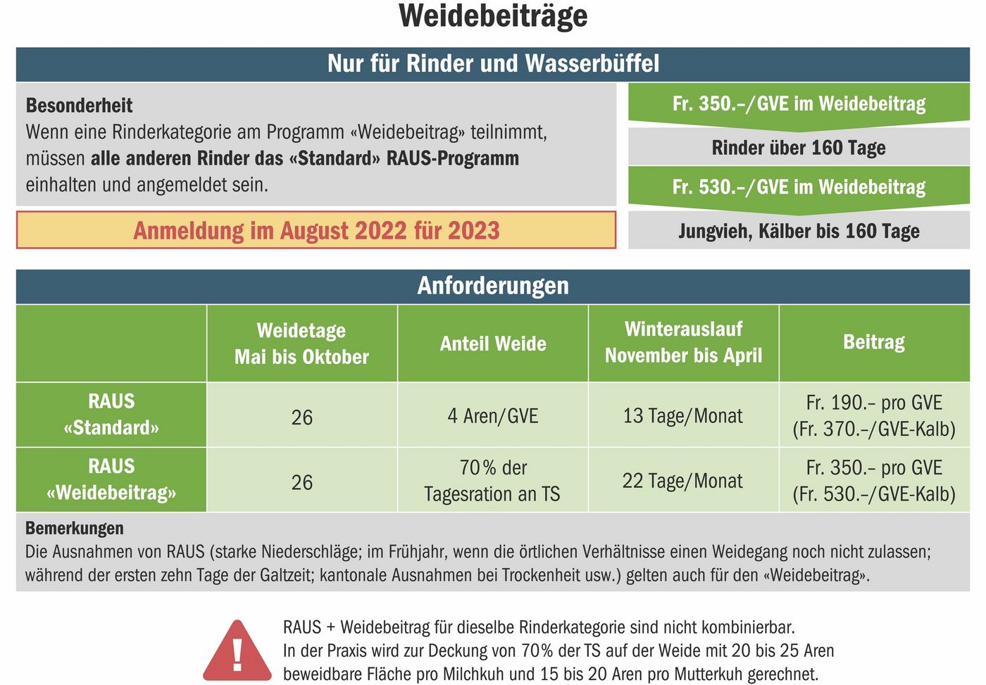 Um 70 % der TS-Tagesration auf der Weide zu decken, sind etwa 20 bis 25 Aren Weidefläche pro Milchkuh und 15 bis 20 Aren pro Mutterkuh erforderlich. Bei starken Regenfällen, Hitzewellen oder längerer Trockenheit und in den ersten zehn Tagen der Galtzeit sind Ausnahmen möglich. Zu beachten ist, dass für das Standard-RAUS neu eine Mindestweidefläche von 4 Aren pro Grossvieheinheit (GVE) vorgeschrieben ist.