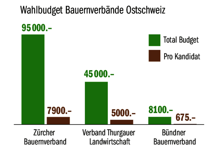 Mit 45'000 Franken unterstützt der Verband Thurgauer Landwirtschaft seine neun Kandidaten. Der Bündner Bauernverband beziffert sein Wahlbudget auf 8100 Franken, unterstützt werden zwölf Kandidaten. Das Wahlbudget, das der St. Galler Bauernverband für die 13 Kandidaten zur Verfügung stelle, bewege sich im tiefen fünfstelligen Bereich, teilt Geschäftsführer Mathias Rüesch mit.