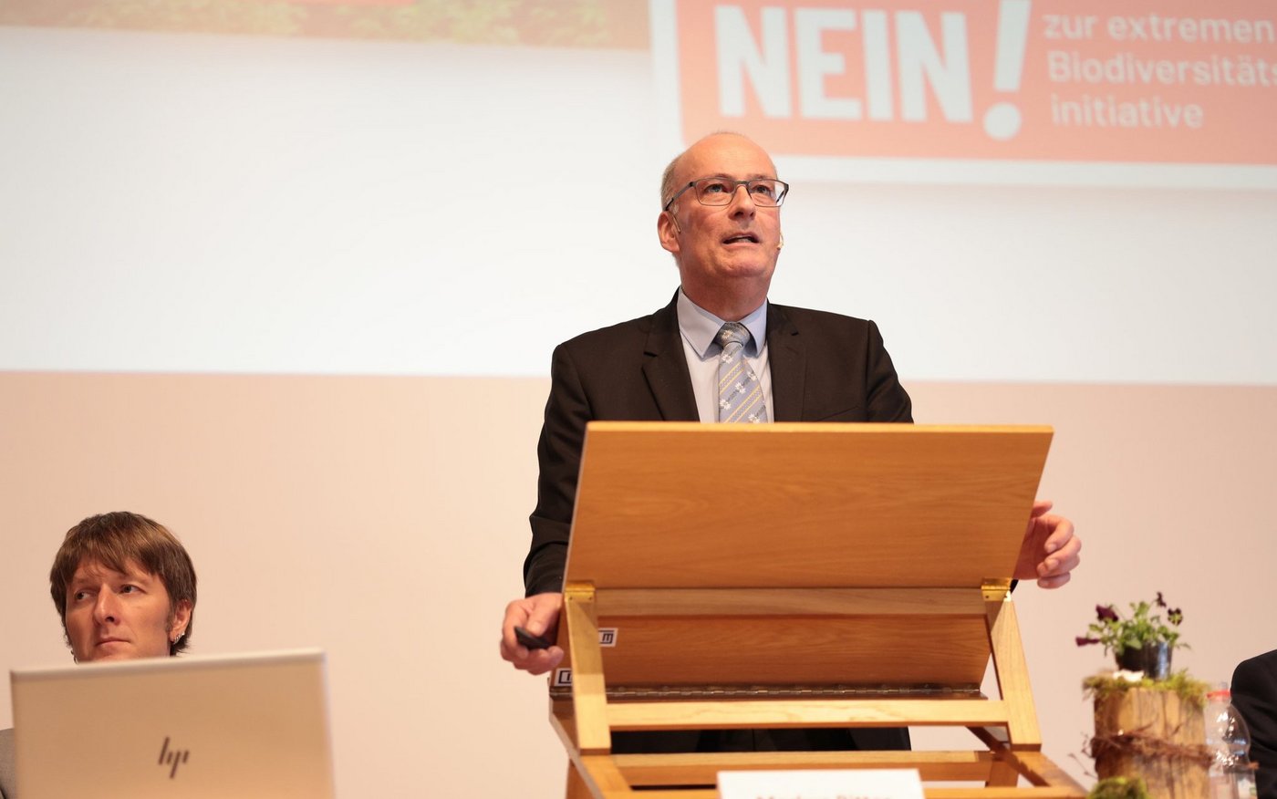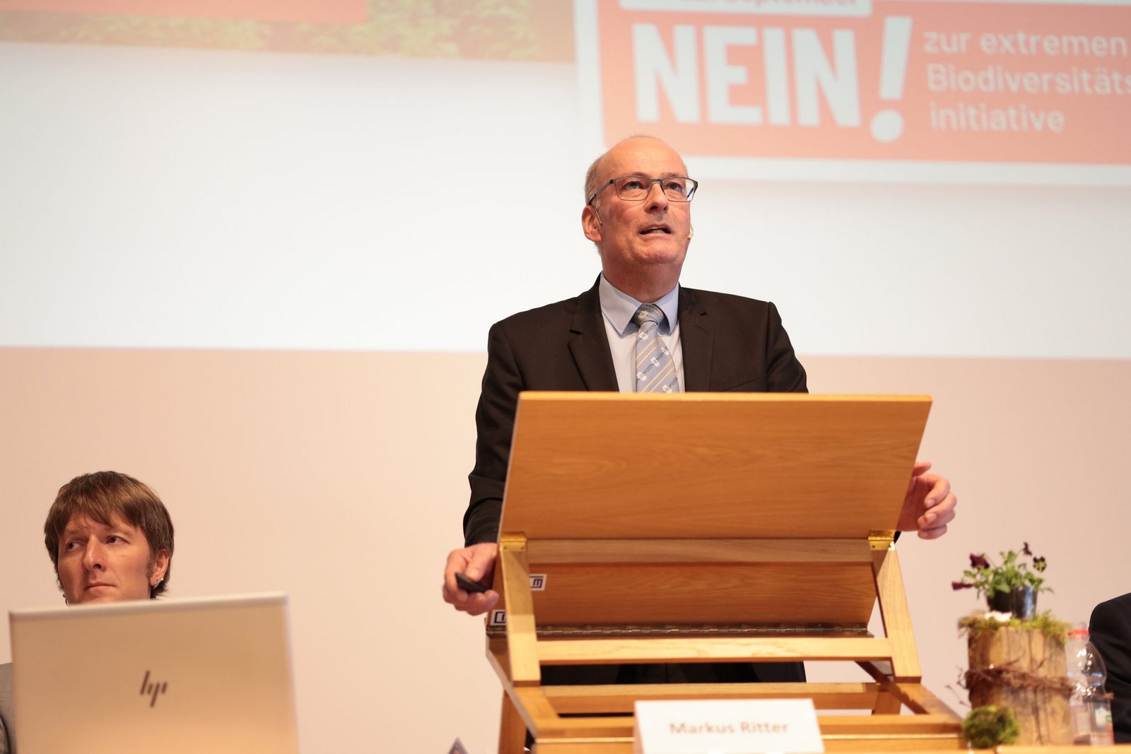 Die Landwirtschaft, die man jetzt sehe, sei vor zehn Jahren aufgegleist worden, so Markus Ritter. Darum sei die Bekämpfung der am 22. September zur Abstimmung stehenden Biodiversitäts-Initiative auch entscheidend. Diese gehe nämlich in die gleiche Richtung. Sie sei sehr breit gefasst und mit den zusätzlich geforderten Biodiversitätsflächen von 900'000 ha für die Landwirtschaft sowie andere betroffene Branchen nicht praktikabel. Die Gegnerschaft sei deshalb entsprechend breit aufgestellt.