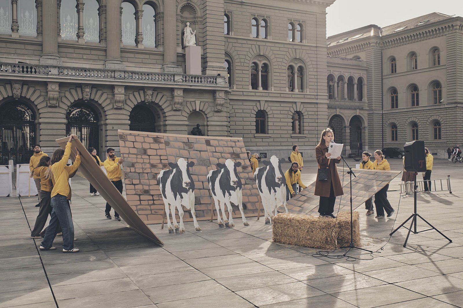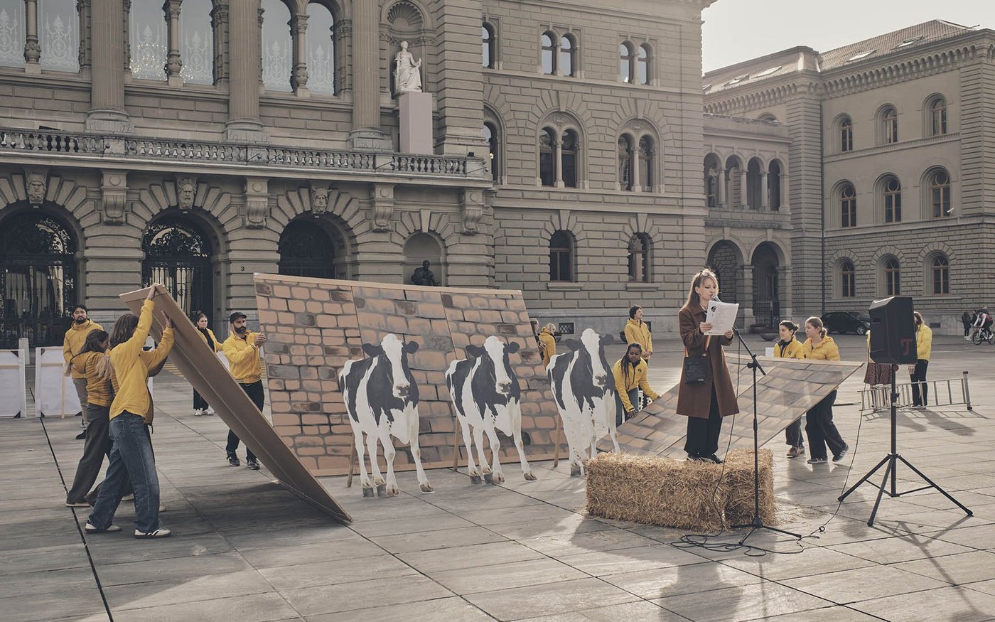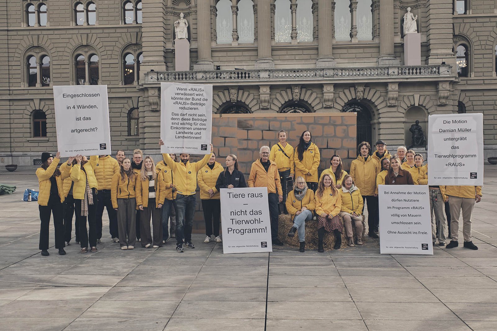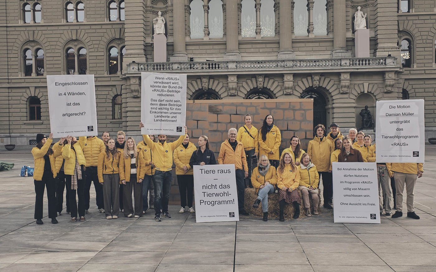 Die Diskussion um RAUS ruft nun aber auch Tierschützer auf den Plan. Vor der Beratung der Motion in der zuständigen Kommission hat die Organisation Pro Nutztier mit einer Aktion auf dem Bundesplatz darauf aufmerksam gemacht. «Wir erachten diese Motion aus schwerwiegenden Gründen als tierschutzwidrig», schreibt der Verein. Er nimmt Punkt für Punkt Damian Müllers Argumentation auseinander und kommt zu dem Schluss, dass der Vorstoss vor allem aus dem Eigeninteresse betroffener Betriebe motiviert scheine. «150 Millionen Franken für ein blaues Fenster im Dach?», fragt Pro Nutztier rhetorisch und verweist auf die Höhe der jährlichen Beitragszahlungen für RAUS.