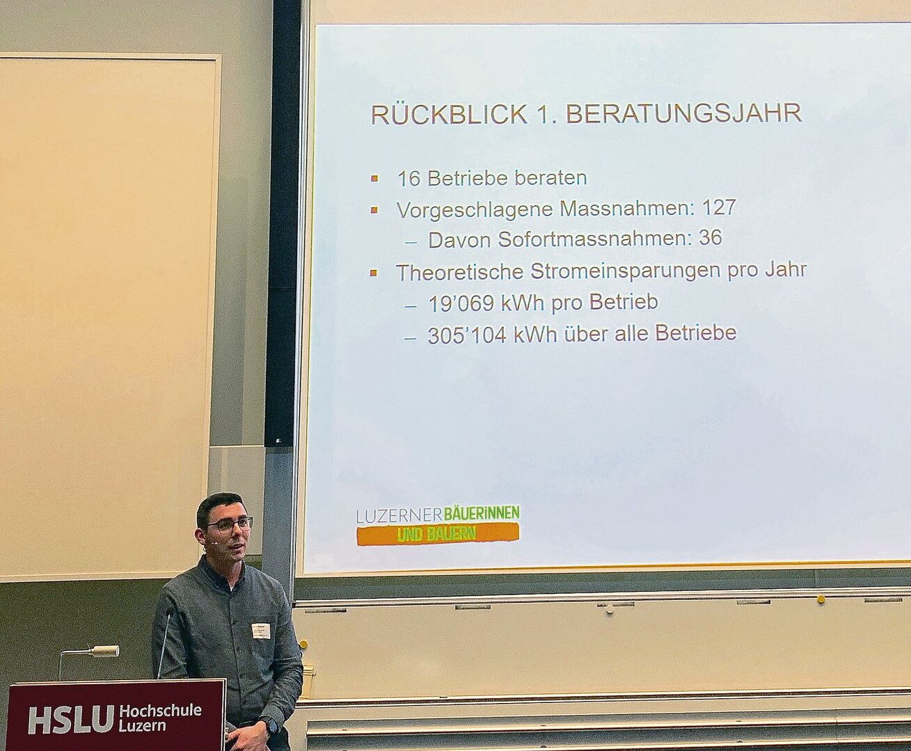 Über 19'000 kWh Strom bei einem durchschnittlichen Verbrauch von fast 70'000 kWh. So viel könnte im Schnitt jeder der 16 untersuchten Betriebe einsparen, wenn sie die vorgeschlagenen Massnahmen der Energieberatung umsetzen. Das ist rund ein Viertel des Verbrauchs, und bei durchschnittlichen Stromkosten von 30 Rappen pro kWh rund 5700 Franken jährlich. Nötig seien dafür allerdings teilweise Investitionen, die aber häufig rasch amortisierbar seien. Darüber orientierte Raphael Heini vom Luzerner Bäuerinnen- und Bauernverband (LBV) an einer Fachtagung des Energie-Apéros Luzern an der Hochschule Luzern. Er zog Bilanz nach dem ersten Jahr mit Energieberatungen für die Landwirtschaft durch den LBV.