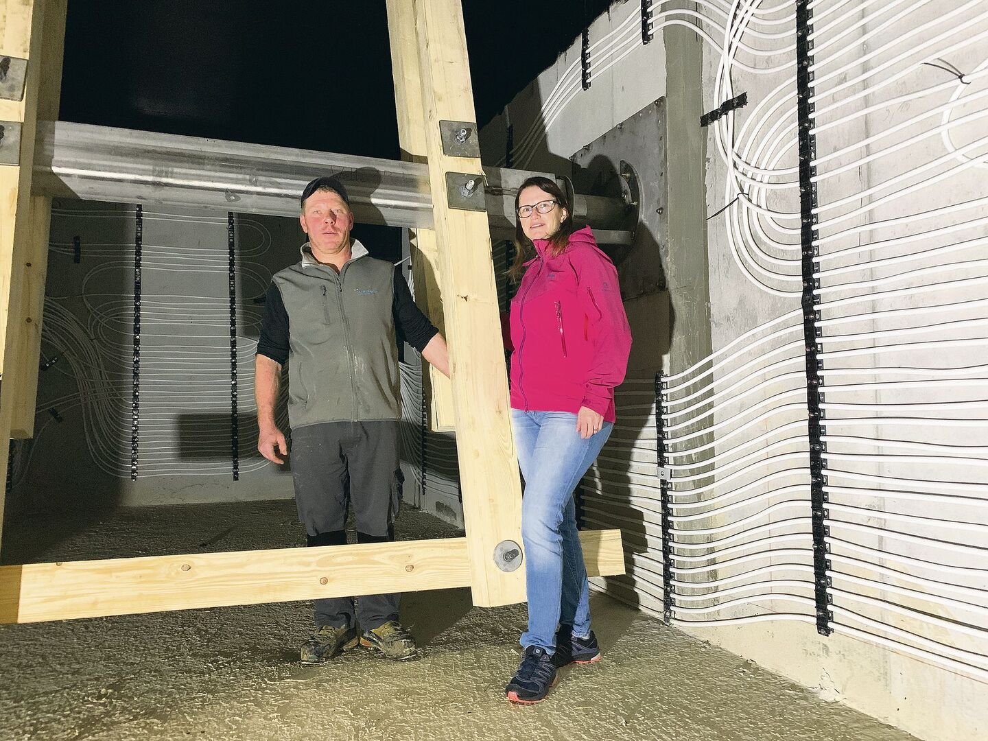 Der vier Meter tiefe und 350 m3 fassende Fermenterraum mit vier Kammern ist mit 1800 m Heizungsrohren an den Wänden ausgelegt, welche sie in Eigenleistung montierten. In den ersten Kammern mit hohem Wärmebedarf sind die Rohre dicht belegt, in den weiteren Kammern immer weniger. Auch das Weisstannenholz für die Rührwerke stamme aus dem eigenen Wald.