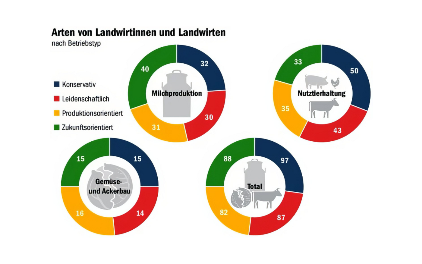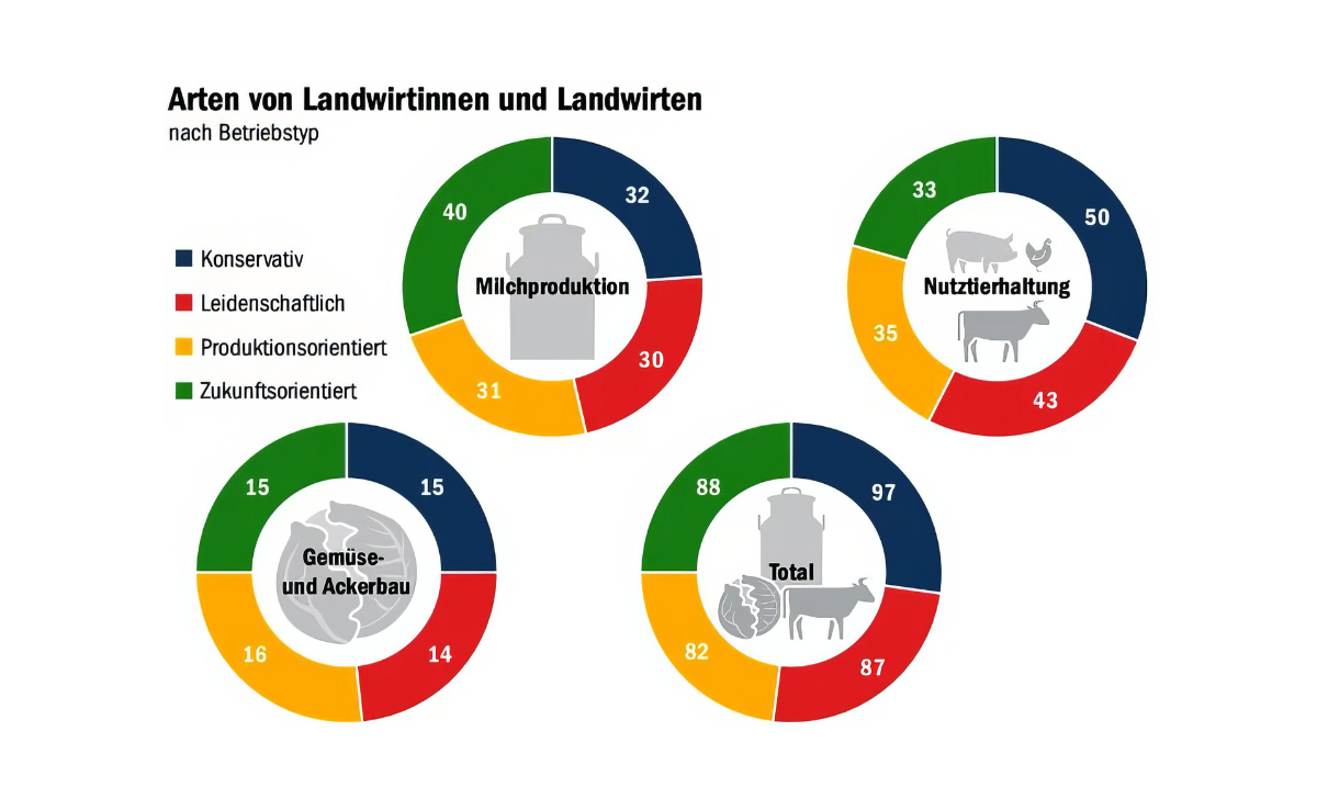 Die Ergebnisse aus der Befragung hätten laut Agrarbericht 2023 gezeigt, dass zukunftsorientierte Landwirtinnen und Landwirte bessere Kontakte und Beziehungen zur Öffentlichkeit und zu anderen Akteuren aus dem Landwirtschaftssektor (z. B. Bauernverbände und kantonale Behörden) pflegen als konservative, leidenschaftliche und produktionsorientierte Landwirtinnen und Landwirte. Sie sehen ihr Sozial- und Familienleben sowie ihr Einkommensniveau auch positiver als konservative und leidenschaftliche Landwirtinnen und Landwirte.