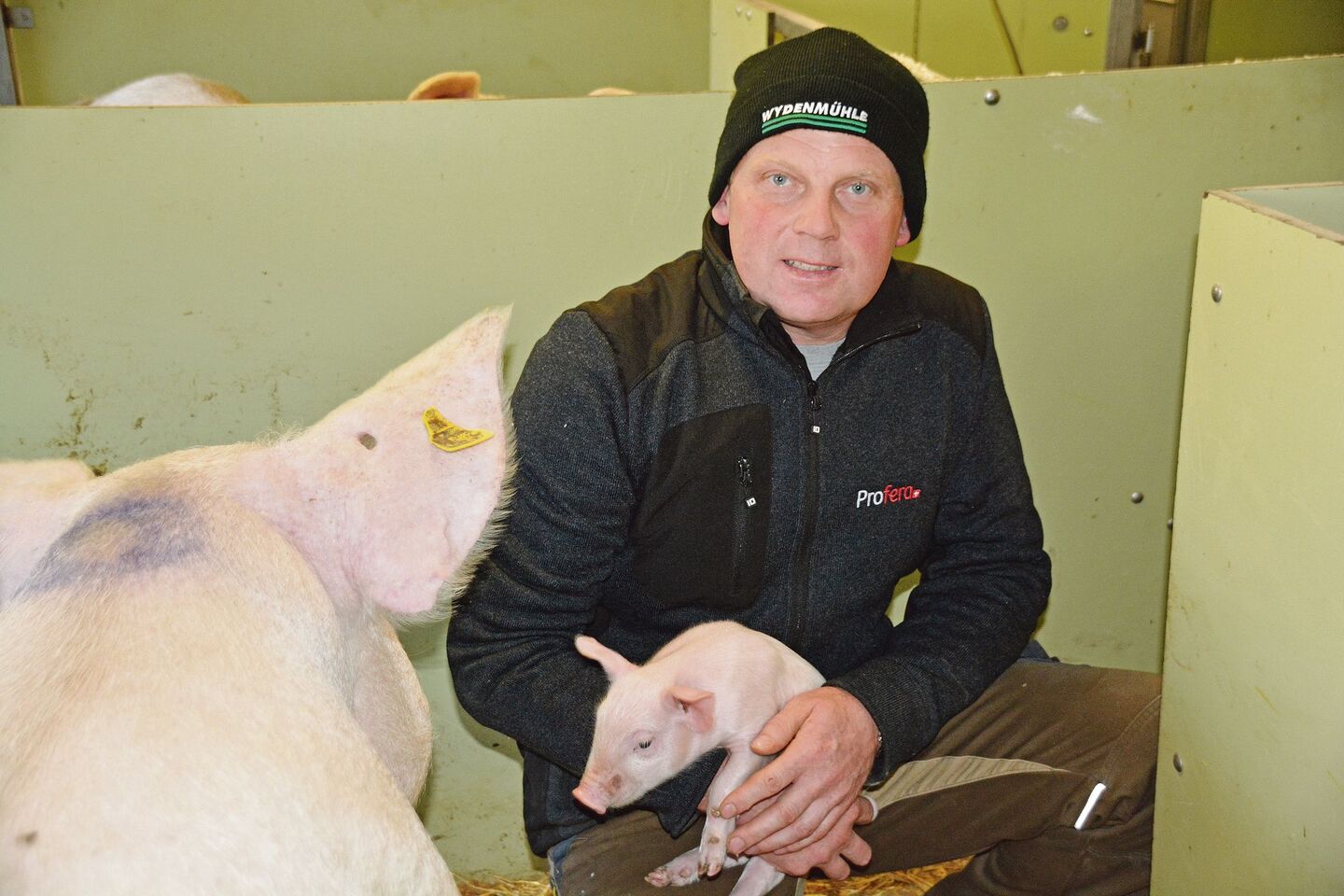 28 bis 29 Ferkel setzt er heute pro Sau und Jahr ab. Aus seiner Sicht nahe am Optimum. Und dies mit «normalem Aufwand», wie er meint. Eine letzte Baisse im Schweinestall erlebte er vor rund zwei Jahren, als die Anzahl tot geborener Ferkel anstieg. Nebst der beschriebenen Ferkelversorgung passte er auch das Futter der hochträchtigen Sauen an. Dieses ist heute reicher an Energie und Spurenelementen. Die Sauen bekommen eine Nassfütterung, bei den Jagern ist es eine trockene Multiphasenfütterung mit drei verschiedenen Futter. Befüllt werden die Silos mit einer Lastwagen-Fuhr. Das Verschneiden der verschiedenen Futter lohne sich für ihn, so die Erkenntnis. Die Sauen bekommen zudem Raufutter zur Sättigung. «So kommt es selten zu Raufereien in den Grossgruppen», sagt der passionierte «Söieler».