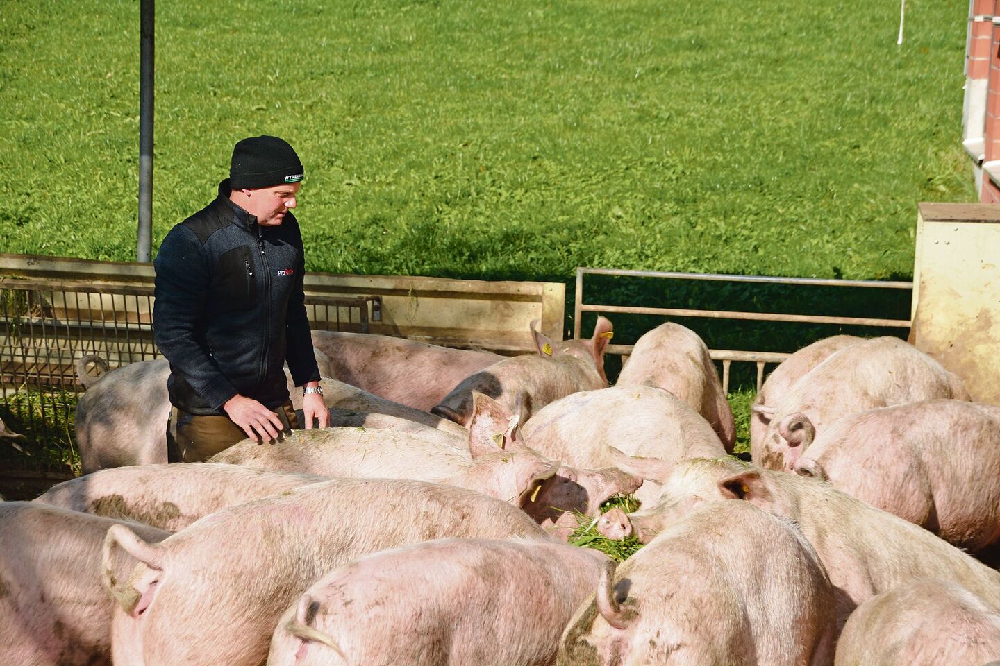 Grüter ist spezialisiert auf die Mastferkelproduktion. Er remontiert fremd, aber nicht im Jungsauenalter wie viele andere, sondern mit 25 bis 35 Kilo schweren Zuchtjagern. Dazu holt er alle zwei Monate 4 bis 5 Tiere ab dem immer gleichen Vermehrungszuchtbetrieb in seiner Gemeinde. Grüters Überlegung dahinter? «Ich habe den Platz für dieses System, die Tiere gewöhnen sich früh an die neue Umgebung, immunisieren sich und ich kann sie als Jungsauen laufend und flexibel in die Gruppen integrieren.» Die Sauen laufen bei ihm in 10er- bis 12er-Gruppen. Alle zehn Tage verlassen 60 bis 70 Ferkel den Betrieb, die meisten in Richtung eines Luzerner Mastbetriebes, der seinerseits nur Grüter als Lieferanten hat und somit keine Mischinfektionen im Stall. Grüters Tiervermarkter ist die Profera, die nach dem bewährten Schweizer Zuchtprogramm arbeitet. Die Zuchtjager sind Primera-F1-Sauen (Schweizer Landrasse × Edelschwein). Der Betriebsleiter setzt auf künstliche Besamung KB und den Endprodukteeber Premo. Im Stall steht zudem ein Eber, für die Rauschekontrolle und zusätzlich einen Natursprung pro Gruppe.
