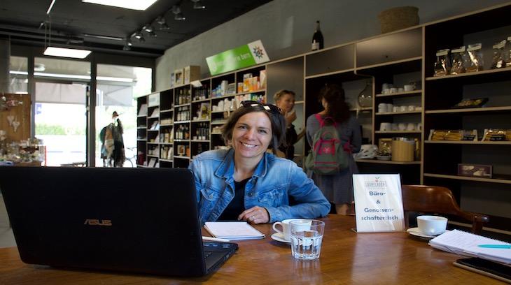 Hier arbeitet Anne Bernasconi an ihrem Laptop. «Unser neuer Dorfladen kommt an», sagt die 43-jährige Betriebswirtschafterin und Kommunikationsspezialistin. Früher arbeitete sie für Umweltorganisationen. Heute leitet sie den Laden in Frauenkappelen BE und ist im Vorstand der Genossenschaft, die dahintersteht. «Eigentlich wollte ich nur bis zur Eröffnung mithelfen. Doch dann hat es mir den Ärmel reingenommen.»