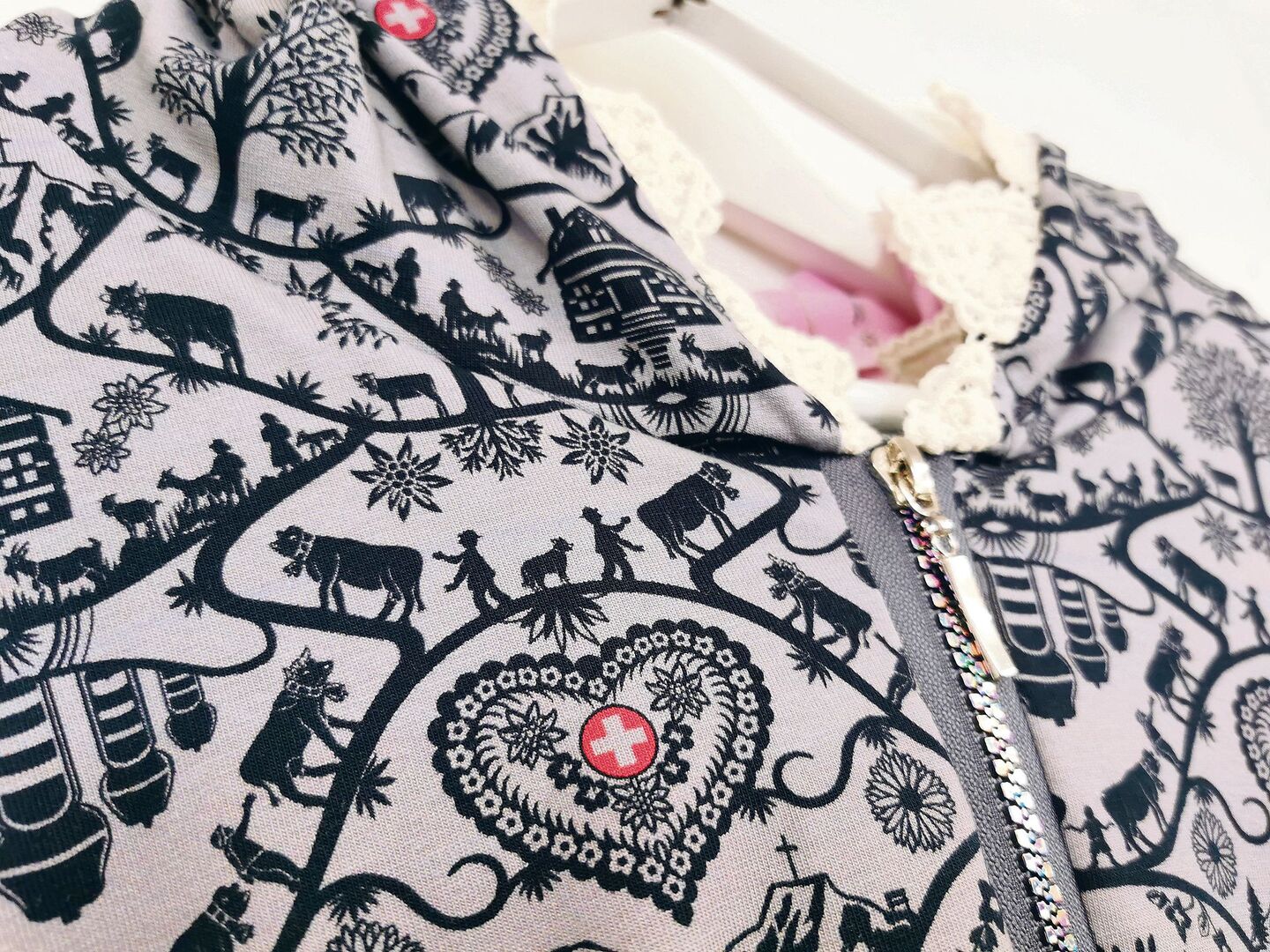 «Ich muss immer etwas machen», sagt sie. «Wenn ich zu Hause bin, dann mache ich Motivtassen. Ich muss immer etwas mit meinen Händen tun.» Die Ideen für die Kleider, aber auch all die handwerklichen Dinge, welche die Nähbegeisterte in ihrem Atelier ausgestellt hat, entstehen beim Machen. Sie liebt Stoffe über alles und erzählt, dass es beinahe eine Sucht sei. «Ich musste als Kind viele Kleider nachtragen, davon habe ich wohl ein Trauma», sagt sie und lacht wieder.