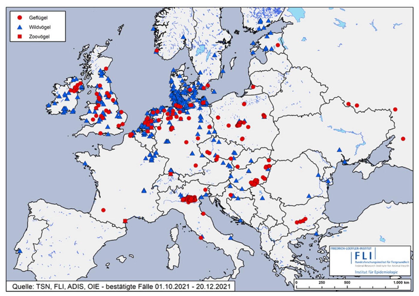 Europaweit wurden den FLI-Daten zufolge in diesem Zeitraum 675 Infektionen bei Wildvögeln und 534 Ausbrüche in Haltungen erfasst. Hinzu kämen Einzelfälle bei Säugetieren: So seien in diesem Jahr bereits nachweislich Rotfüchse in den Niederlanden und Finnland, Kegelrobben in Schweden, Seehunde unter anderem in Deutschland und Fischotter in Finnland an Vogelgrippe erkrankt.