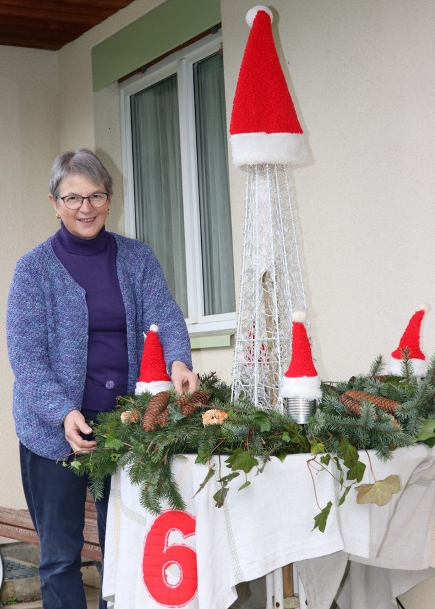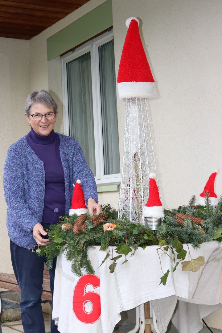 «Die Adventsfenster bringen einen Moment des Innehaltens in die hektische Adventszeit», findet Erika Hubeli. Und das Nähen, Stricken und Werken für die Fenster hätten ihr einfach Spass gemacht. Auch wenn sie dafür manche Nachtschicht einlegen musste, wenn etwa das grosse Lebkuchenhaus nicht zusammenhalten wollte. Ihr Ehemann Martin Hubeli rettete das Werk mit einem Unterbau aus Holz und war auch sonst ein wichtiger technischer Helfer. Einmal sogar als lebendiger Samichlaus im Adventsfenster. Dank ihm ist auch der riesige Adventskranz für den 6. Dezember in diesem Jahr eine stabile Konstruktion: Ein Stück Gülleschlauch im Innern gibt den Tannenästen Halt.