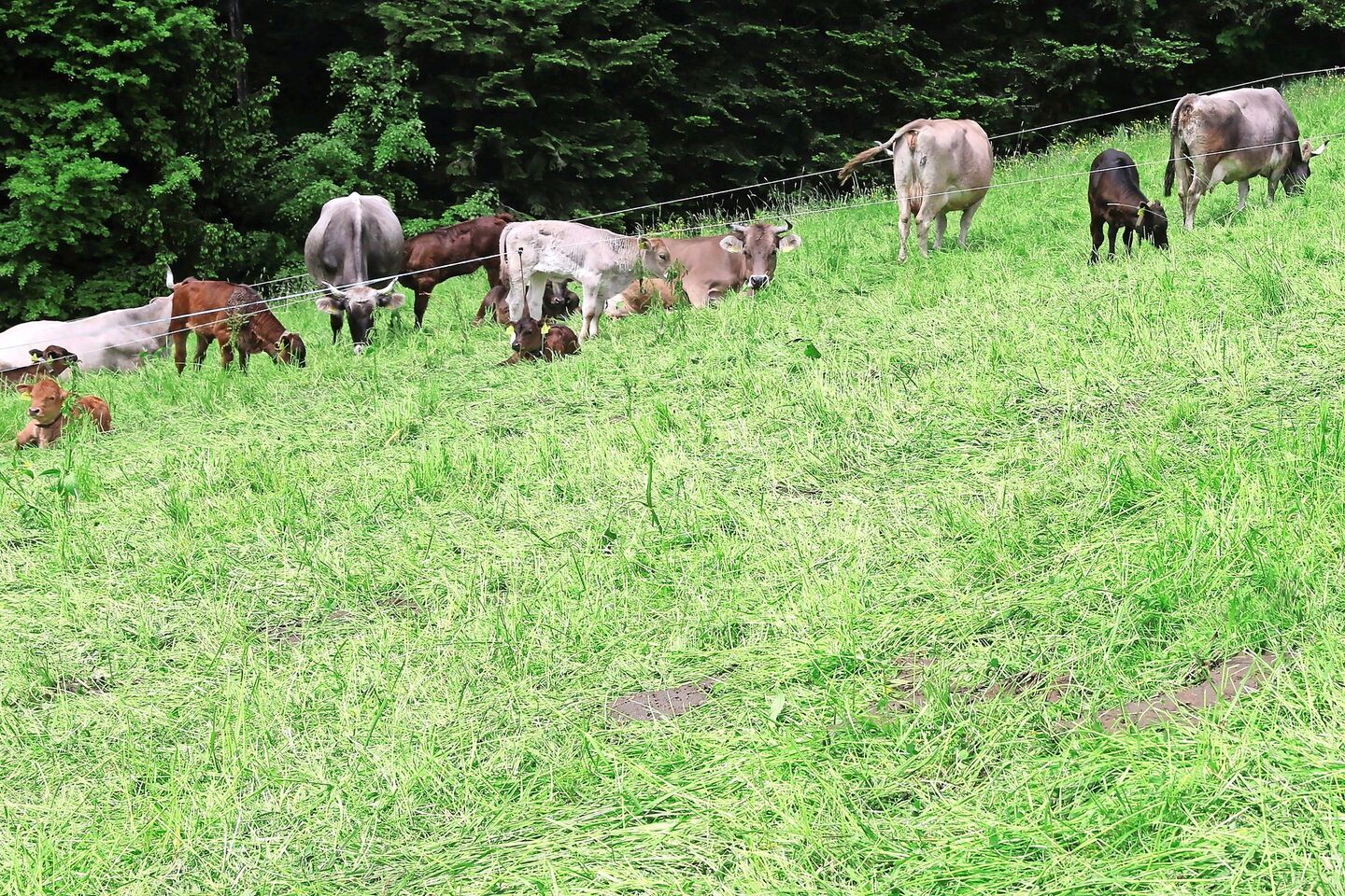 Die rund zwölf Kühe der Rassen Original Braunvieh und Grauvieh kalben saisonal von Februar bis Mai ab. Über die Sommermonate läuft ein Angus-Muni in der Herde mit. «Wir kaufen meist einen gut einjährigen Stier. Da wir kleine Kühe haben, können diese auch von einem jungen Stier gesprungen werden.»