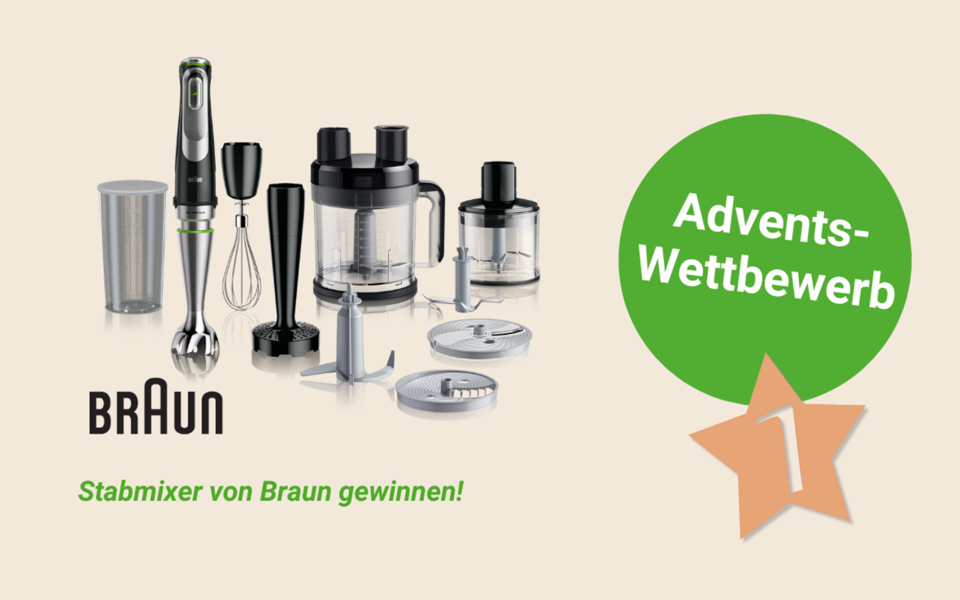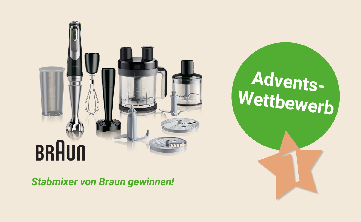 - Gewinnen – Durch das Absenden des Formulars nehmen Sie automatisch an der Verlosung des Braun Stabmixers MultiQuick 9 teil. Die Gewinnerin oder der Gewinner wird anschliessend persönlich kontaktiert.
