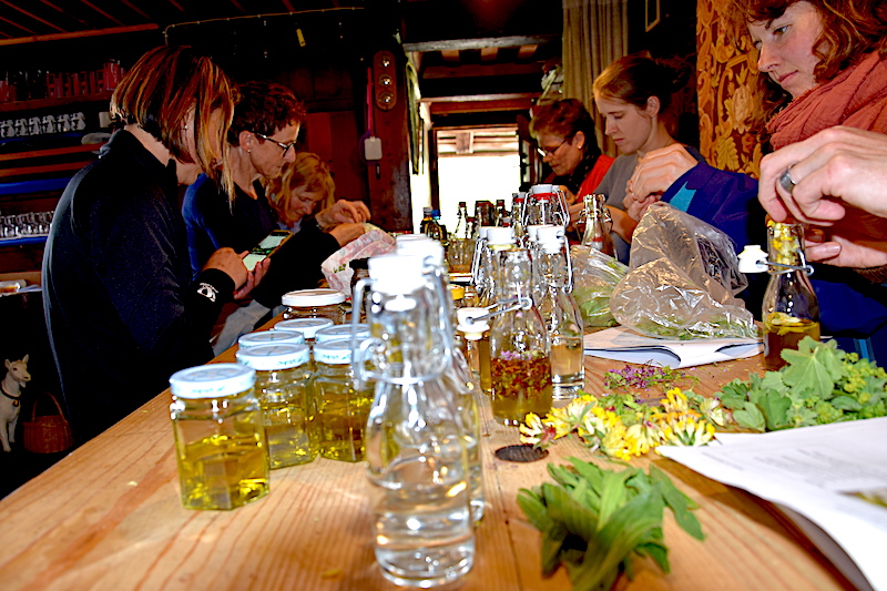 Auch bei der Salbenherstellung ist Gemeinschaft gefragt. Alle steuern gesammelte Tannenspitzen bei oder für die Brecca-Salbe ein Gemisch aus Kräutern. Erst nachher werden die selber mitgebrachten Gläser oder Fläschchen, die mit Öl und Alkohol gefüllt sind, befüllt. Die so hergestellten Öle und Tinkturen, können dann zu Hause weiterverarbeitet werden.