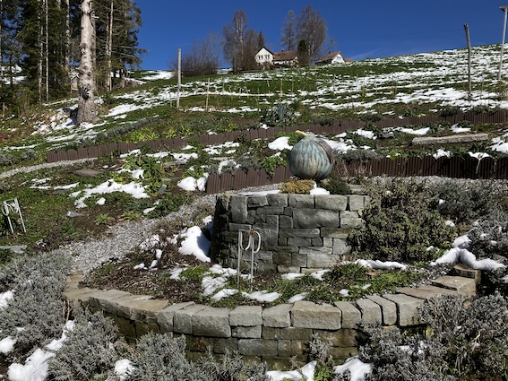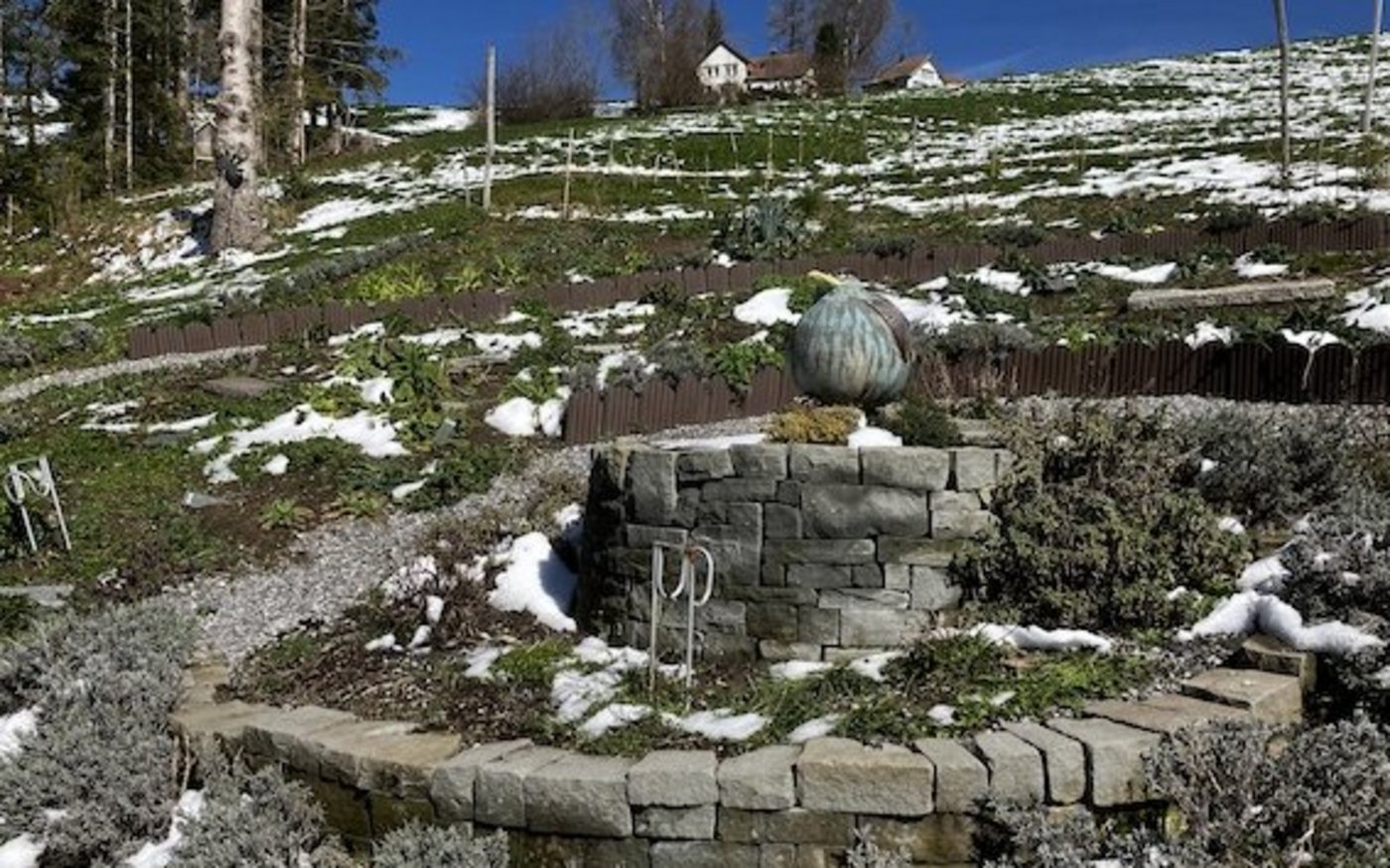 Rote Punkte auf grünen Blättern: Die ersten Marienkäfer der Saison haben in den Kräutergarten von Martina Rocco im appenzellischen Wald gefunden. Da und dort liegt noch etwa Schnee, doch der Frühling ist auch auf rund 960 m ü. M. spürbar im Kommen.