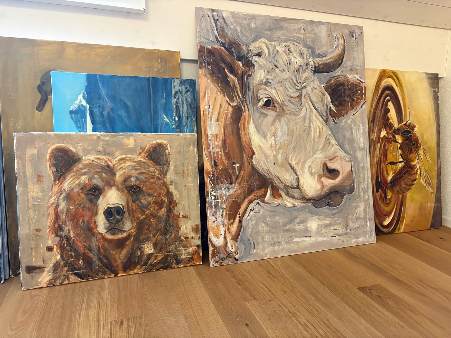 «Am liebsten male ich Simmentaler, schöne, kräftige Kühe, immer mit Hörnern», sagt Urs Aebersold. Er mag die Ockertöne. Überhaupt sind Kühe die Lieblingsmotive des 36-Jährigen, der tagsüber als Ladenleiter den Landi-Laden Thierachern führt und nachts gerne den Pinsel schwingt. Oder abends, sobald die Kinder schlafen, oder in den Ferien: «Aber dann hat natürlich die Familie Vorrang.» Aebersold malt aber auch gerne einheimische Tiere, Steinböcke, Gämsen, Schwäne, Schwalben. Auch den einen oder anderen Bären findet man in seiner Sammlung.