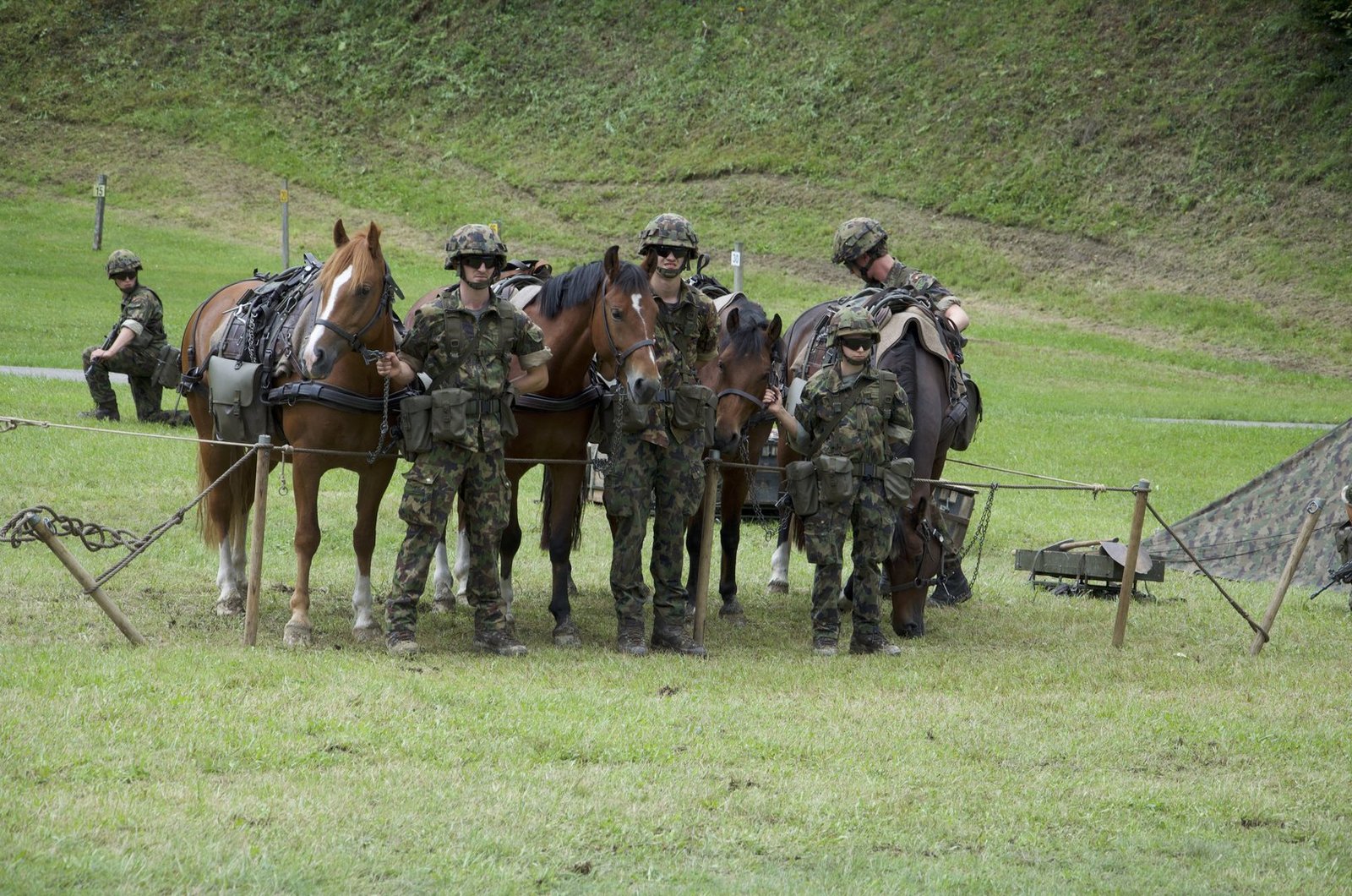 Auf der gegenüberliegenden Seite steigt eine weitere Traingruppe über einen Wall ab. Eine Vorhut sichert zuvor das Gelände ab. Danach steigen die Rekruten mit ihren Pferden vorsichtig das unwegsame Gelände hinunter. Pferd und Soldat müssen in solchen Situationen eng zusammenarbeiten. Auf flachem Gelände angekommen, geht es für die Gruppe an den Aufbau eines Biwaks. Innert fünf Minuten muss das Nachtlager stehen.