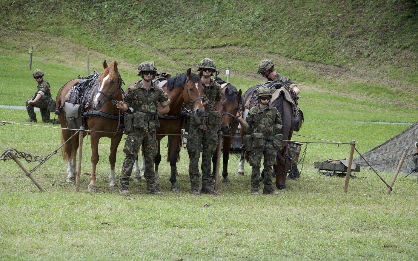 Auch die Truppe am Biwak ist fertig und die Pferde können sich erholen. Ebenso hat die Truppe für sich selbst ein Zelt errichtet. Ein wichtiger Grundsatz aber lautet: «Zuerst mein Tier, dann ich.» Mit der Pferdewache wird sichergestellt, dass die Tiere stets optimal versorgt sind und ruhig im Biwak stehen.