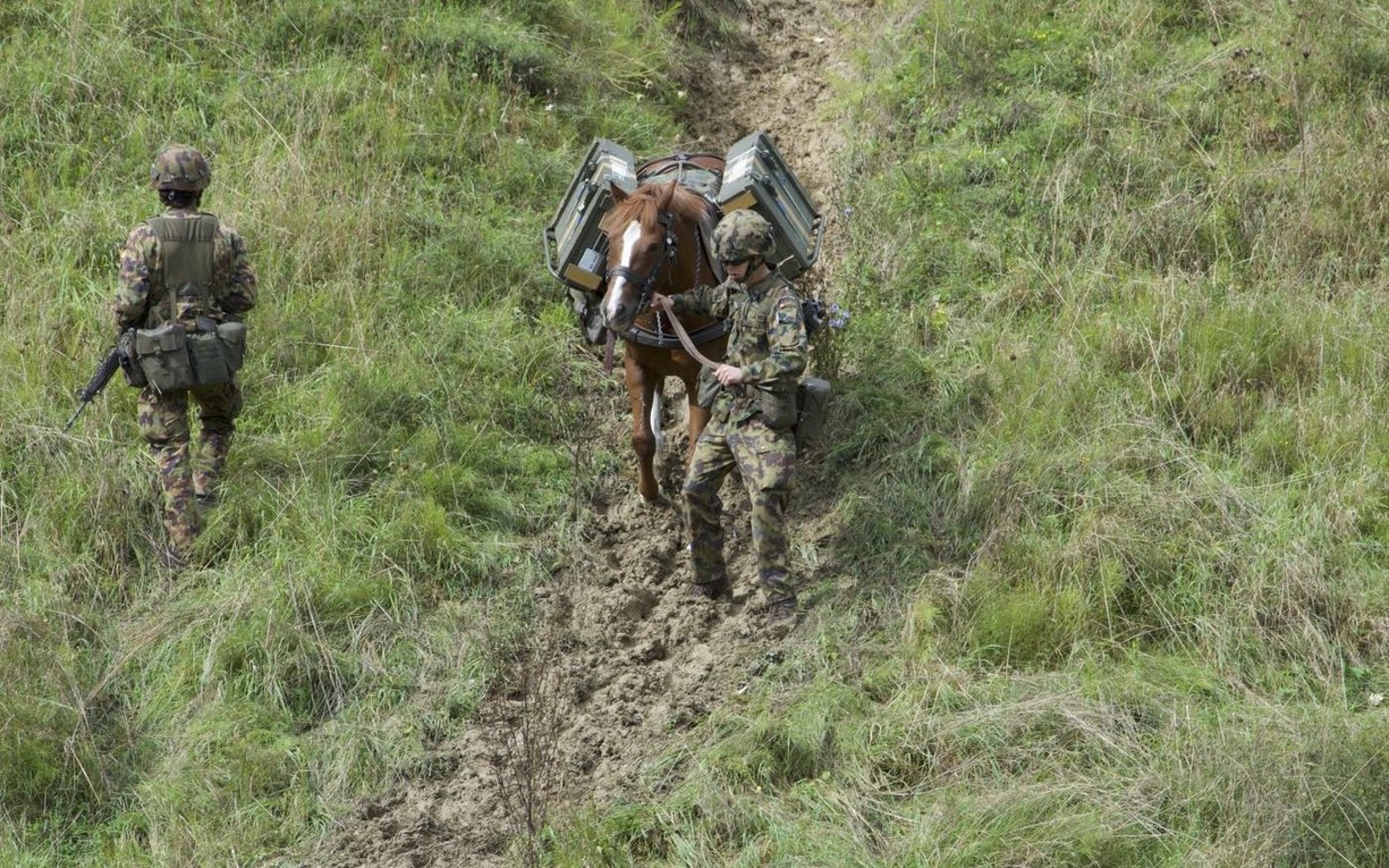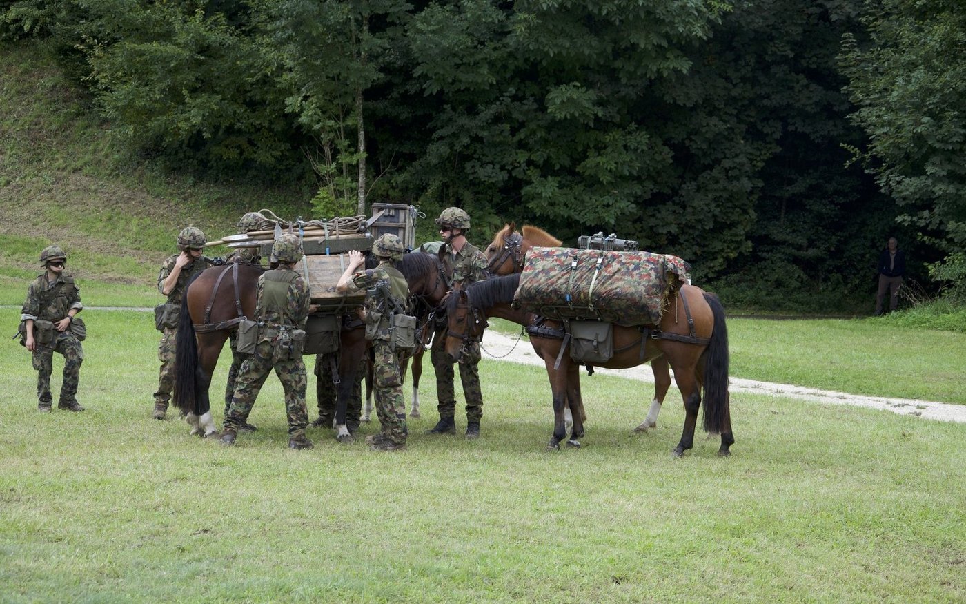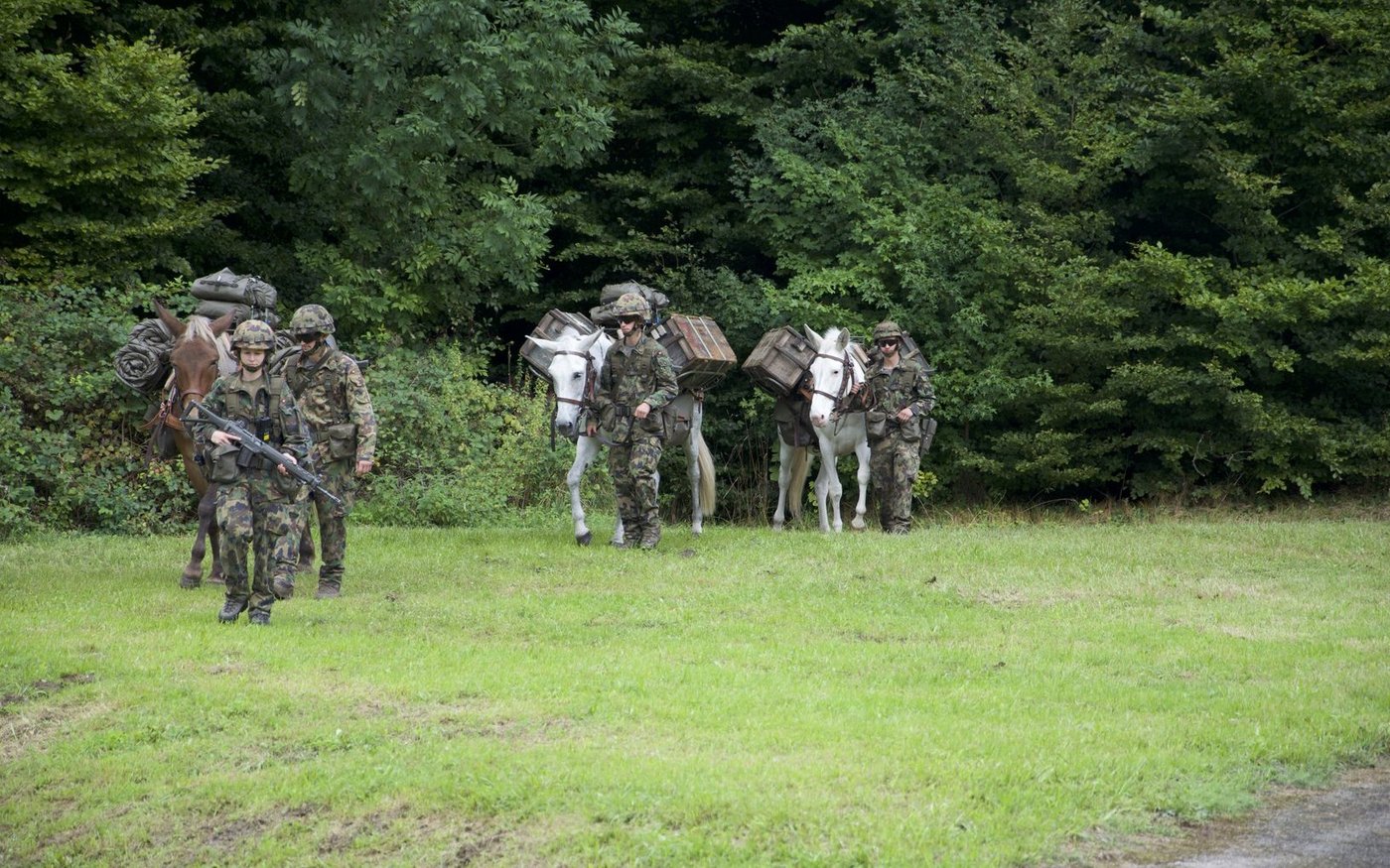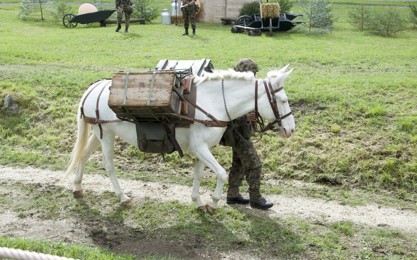 Aus dem Wald auf der gegenüberliegenden Seite tritt eine weitere Traingruppe, angeführt von drei Rekruten mit ihren Maultieren, gefolgt von Freibergerpferden. Sie bringen Verpflegung, Rucksäcke und Wassersäcke mit. Auf diese Weise können auch Truppen beliefert werden, die an Standorten stationiert sind, die mit dem Fahrzeug nicht erreichbar sind.