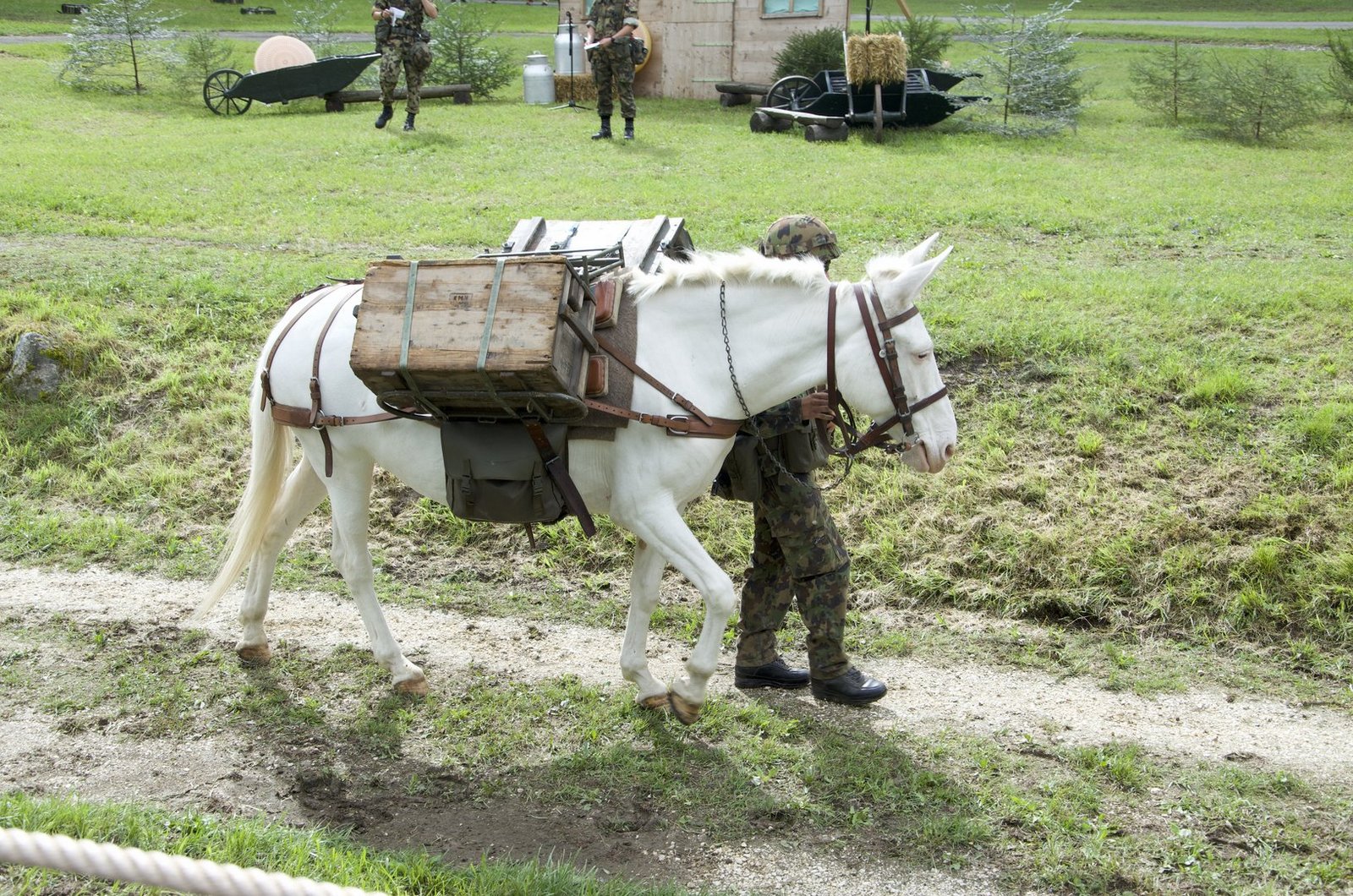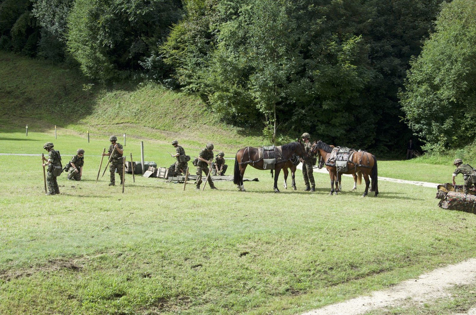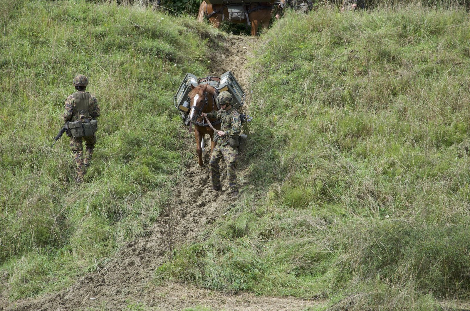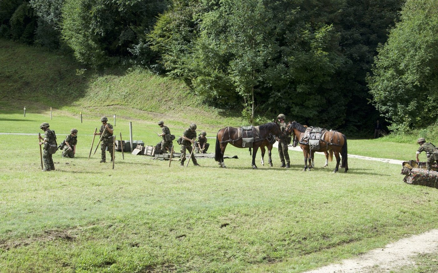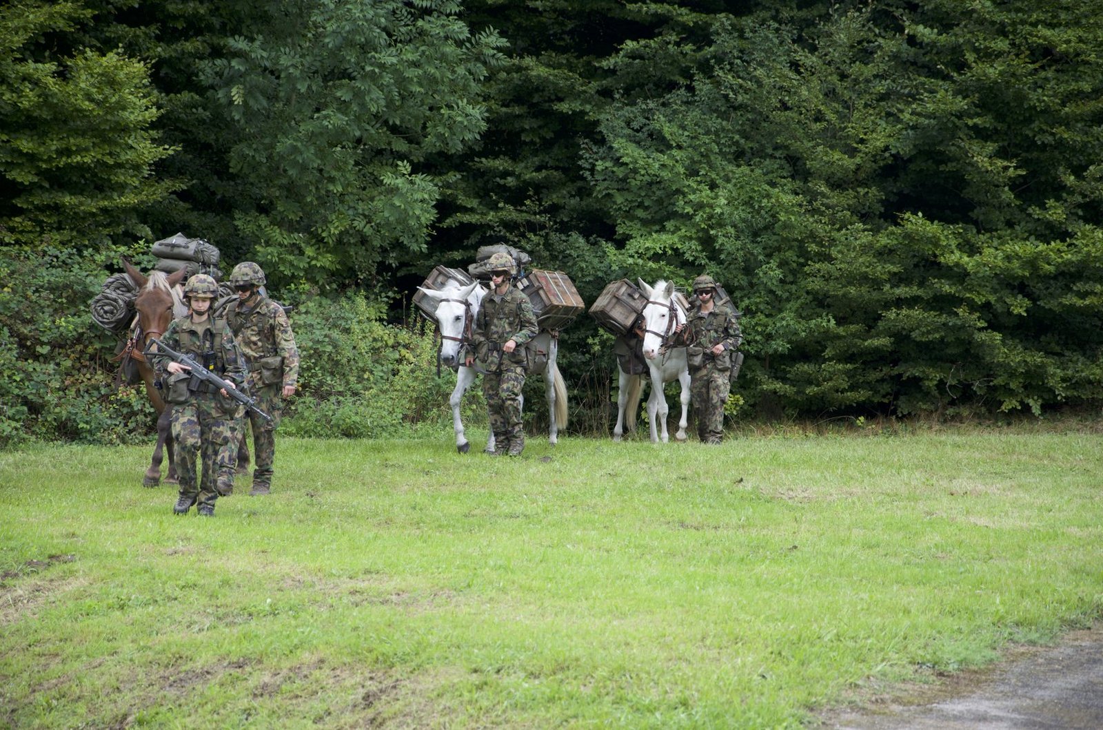 Aus dem Wald auf der gegenüberliegenden Seite tritt eine weitere Traingruppe, angeführt von drei Rekruten mit ihren Maultieren, gefolgt von Freibergerpferden. Sie bringen Verpflegung, Rucksäcke und Wassersäcke mit. Auf diese Weise können auch Truppen beliefert werden, die an Standorten stationiert sind, die mit dem Fahrzeug nicht erreichbar sind.