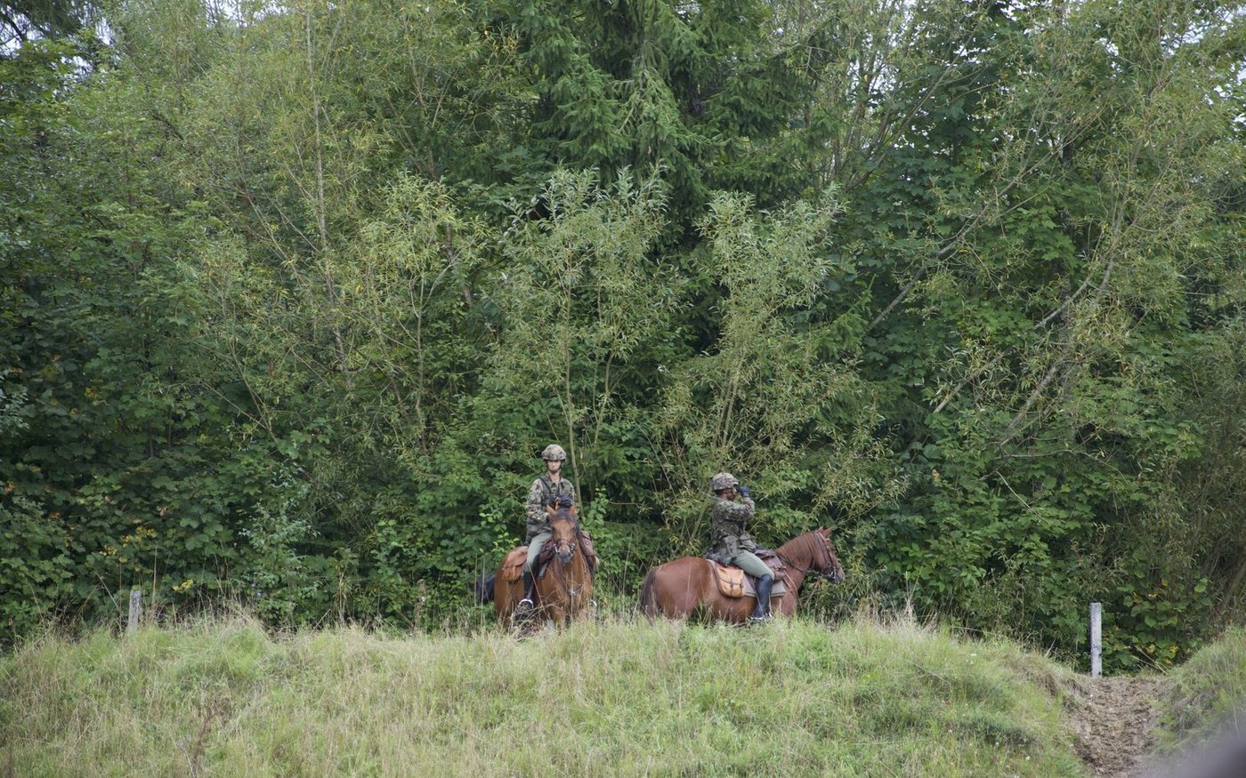 Plötzlich wird eine verdächtige Person mit einem grauen Rucksack gesichtet. Die Patrouillenreiter reagieren sofort und halten die Person an. Während ein Soldat absteigt und die Person anspricht, sichert sein Partner die Deckung. Der Rucksack wird überprüft, die Person abgeführt.
