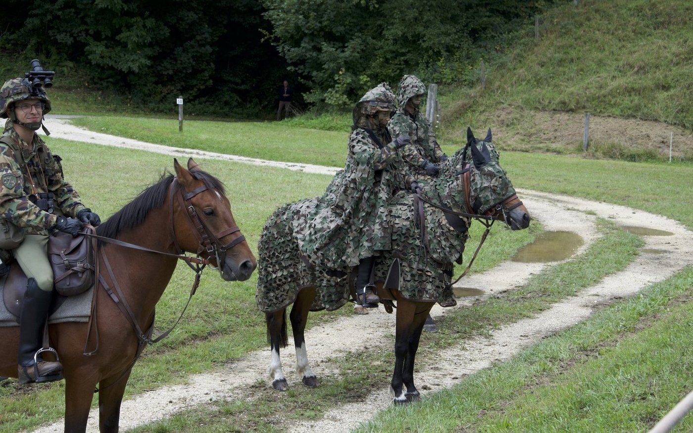 Der Soldat mit dem Akkordeon wird nach einigen Minuten von zwei Leutnants abgelöst. «Wo findet das Pferd zwischen Kampfpanzern und Kamikazedrohnen auf dem modernen Schlachtfeld noch seinen Platz? Wir möchten ihnen einen anderen Aspekt der Kriegsführung zeigen und zeigen, was dort passiert, wo kein Rad fährt», erklärt einer der Leutnants.