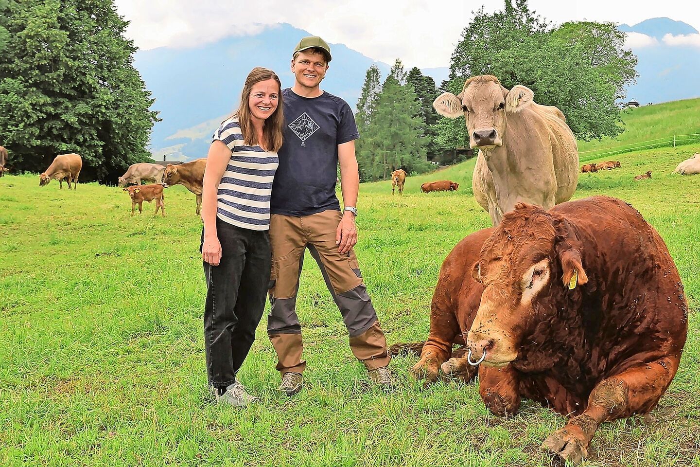 Priska und Flavian Schwitter sind die Betriebsleiter vom Erlebnishof Vorsäss. 2006 übernahmen die beiden den damaligen Milchwirtschaftsbetrieb von Flavians Eltern. Nachdem sie zusätzlich noch einen Nachbarbetrieb mit Mutterkühen pachten konnten, stellten sie den gesamten Betrieb auf die Mutterkuhhaltung um. 27 Kühe mit Kalb plus Muni Cäsar leben auf dem heute 19 Hektaren grossen Hof.